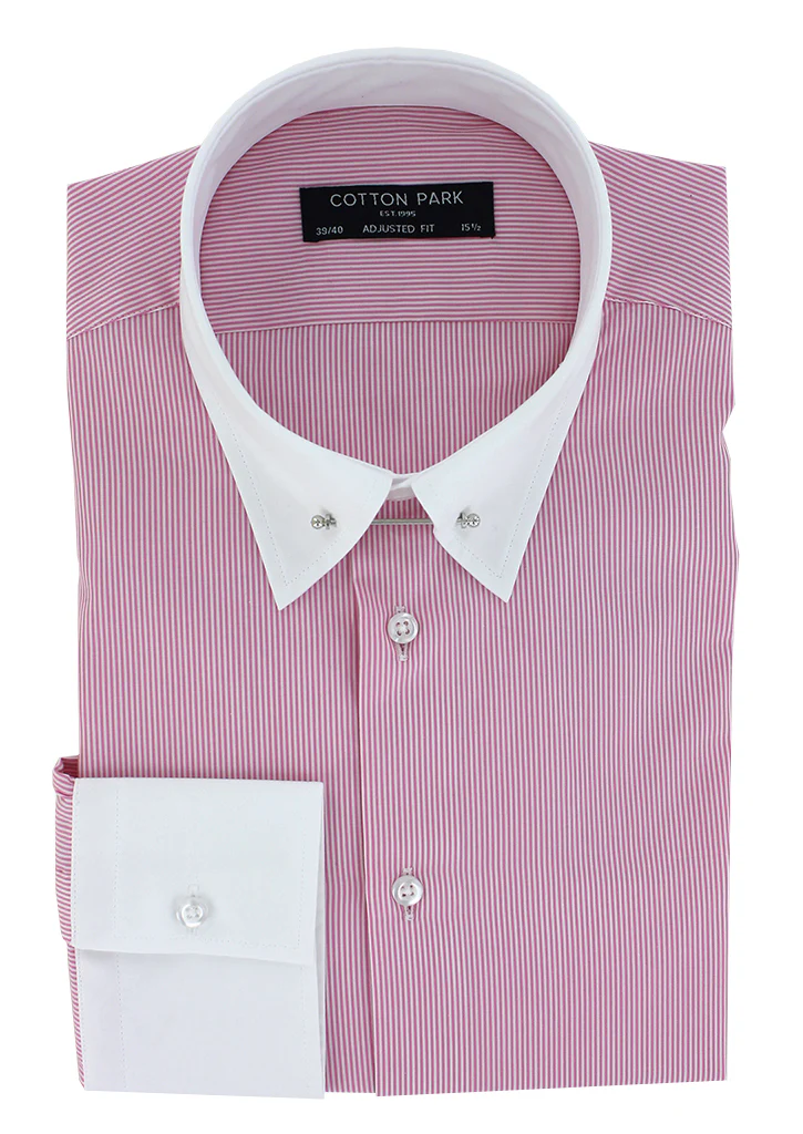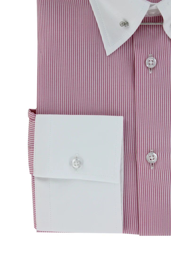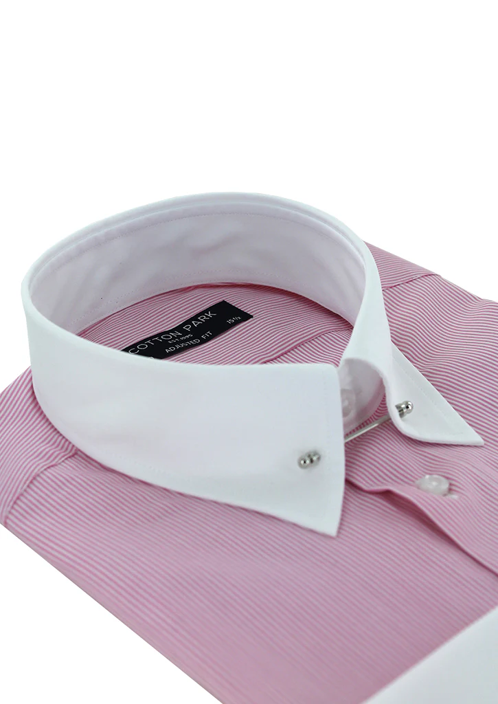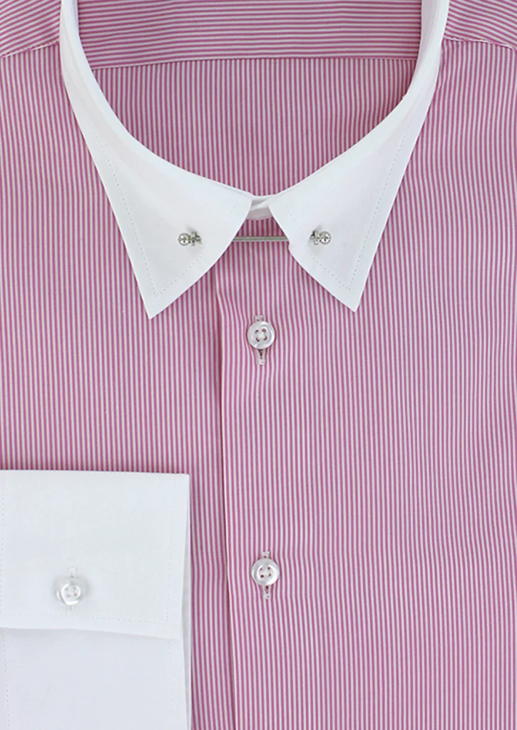Chemise coupe cintrée pour homme à rayures roses possédant un col anglais blanc à barrette de couleur argent.