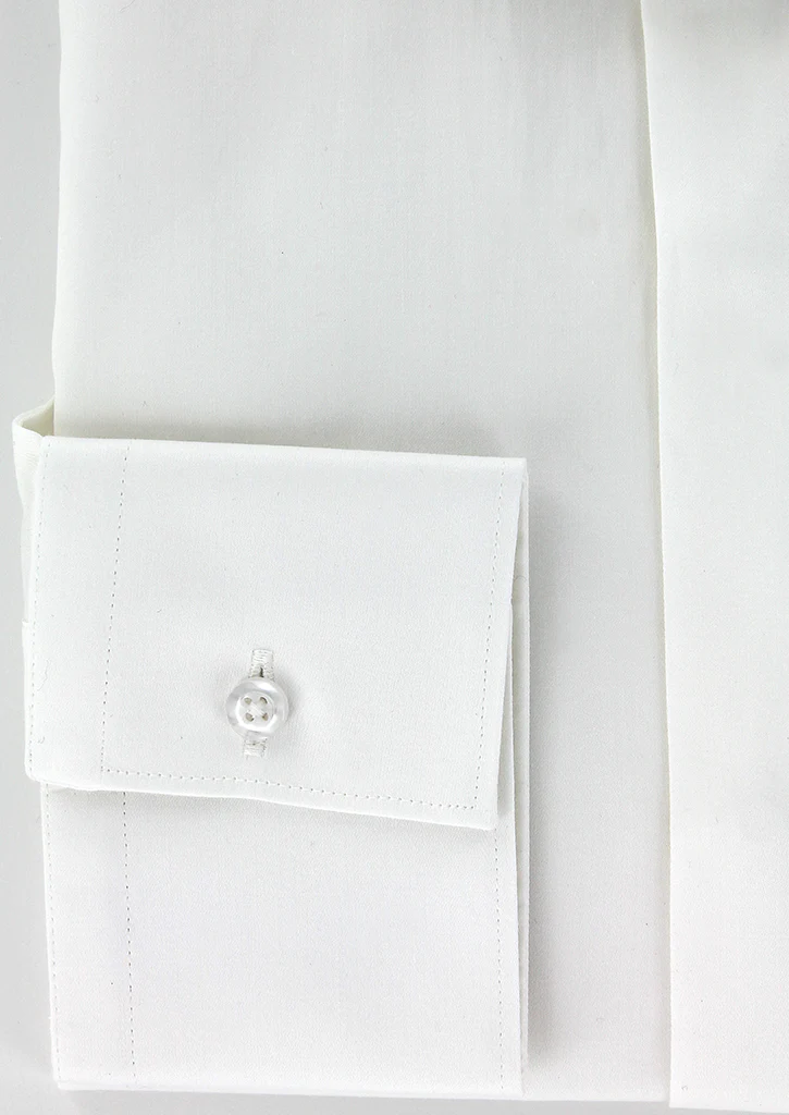 Chemise de cérémonie Cotton Park pour homme en satin de coton écru. Cette chemise en coupe ajustée à manches longues possède un col cassé idéal pour porter un noeud papillon. En un coup de main, il est possible de rendre ce poignet simple en poignet mousquetaire et ainsi porter une jolie paire de bouton de manchette Cotton Park. Son col a été spécialement étudié dans le but de cacher l’attache du nœud papillon à l’arrière de la chemise.