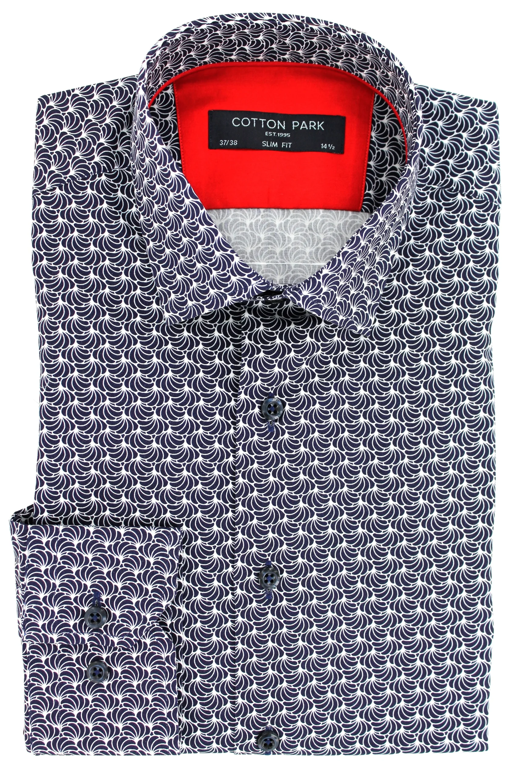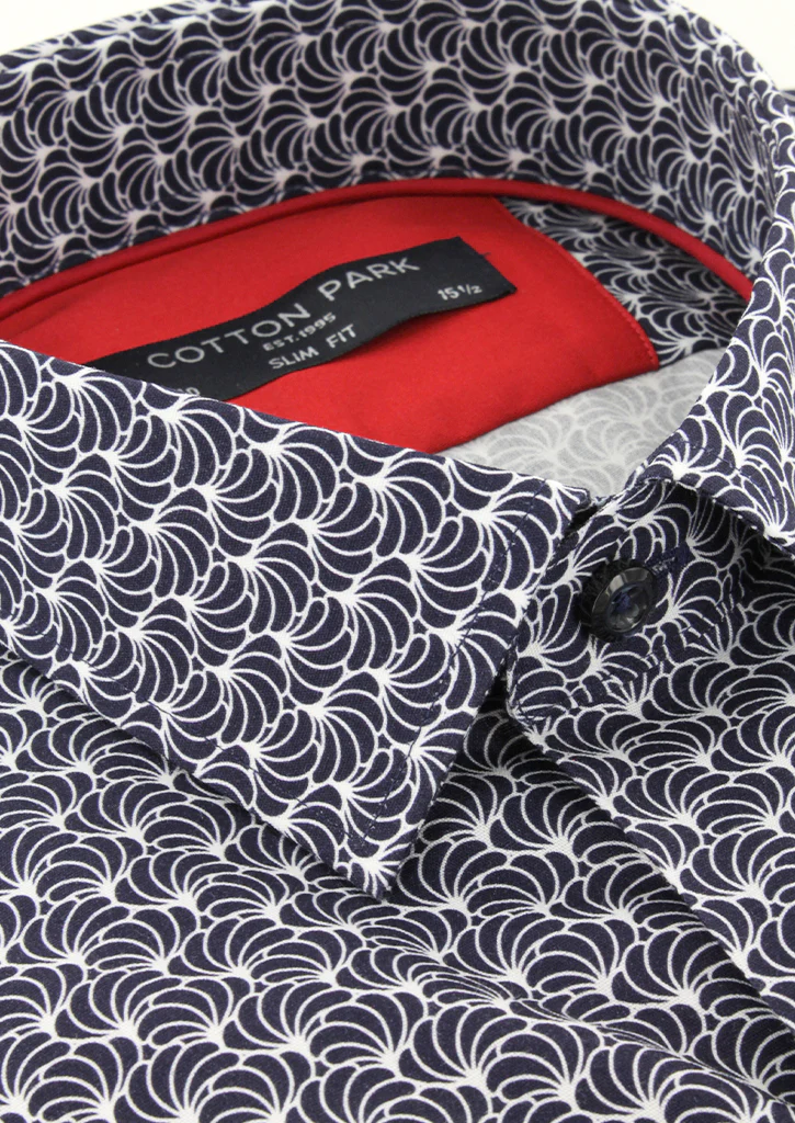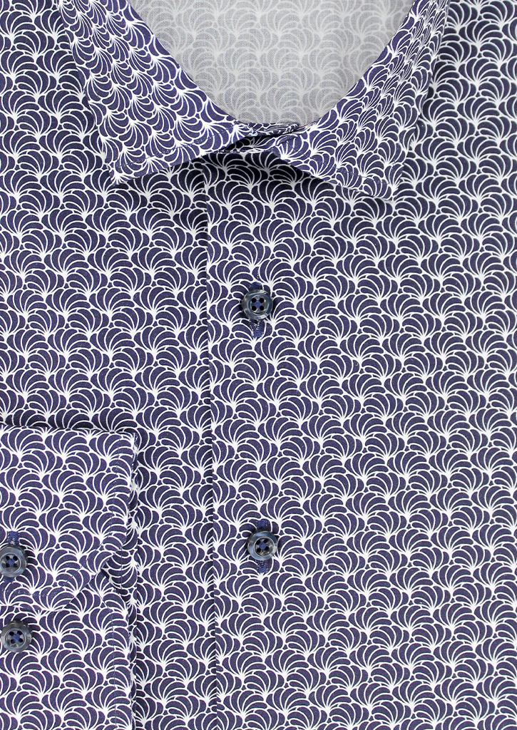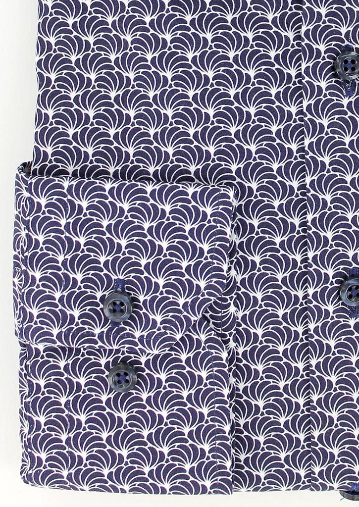 Cette chemise imprimée bleu marine vous est proposée en coupe cintrée, mettant en valeur la silhouette masculine, avec des motifs bleu marine et blancs qui ajoutent une touche de style à votre tenue. Elle est également pourvue d’un petit col, apportant une touche de modernité à son design.