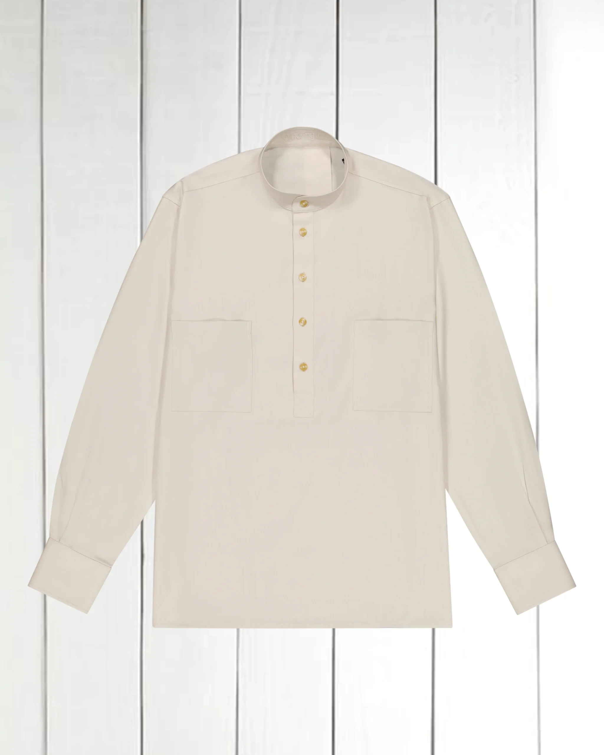 chemise col mao en toile de coton et clycell natural __TAB__ fiche technique Chemise col mao Coupe droite Manches longues Poignets à double boutonnage Deux poches poitrine Patte de boutonnage jusqu’à mi-corps Pli d’aisance au dos Col et poignets légèrement entoilés Composition : 59 % coton, 41 % clycell tissé en Italie Fabriquée au Portugal […]