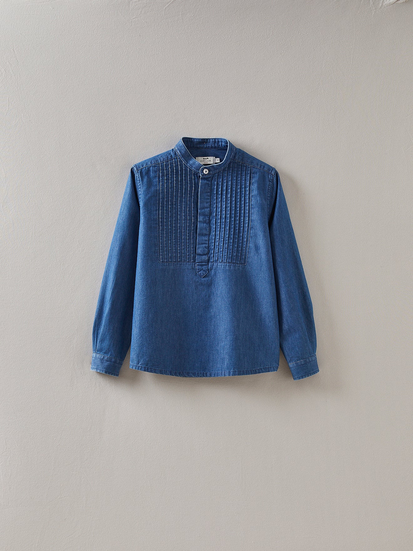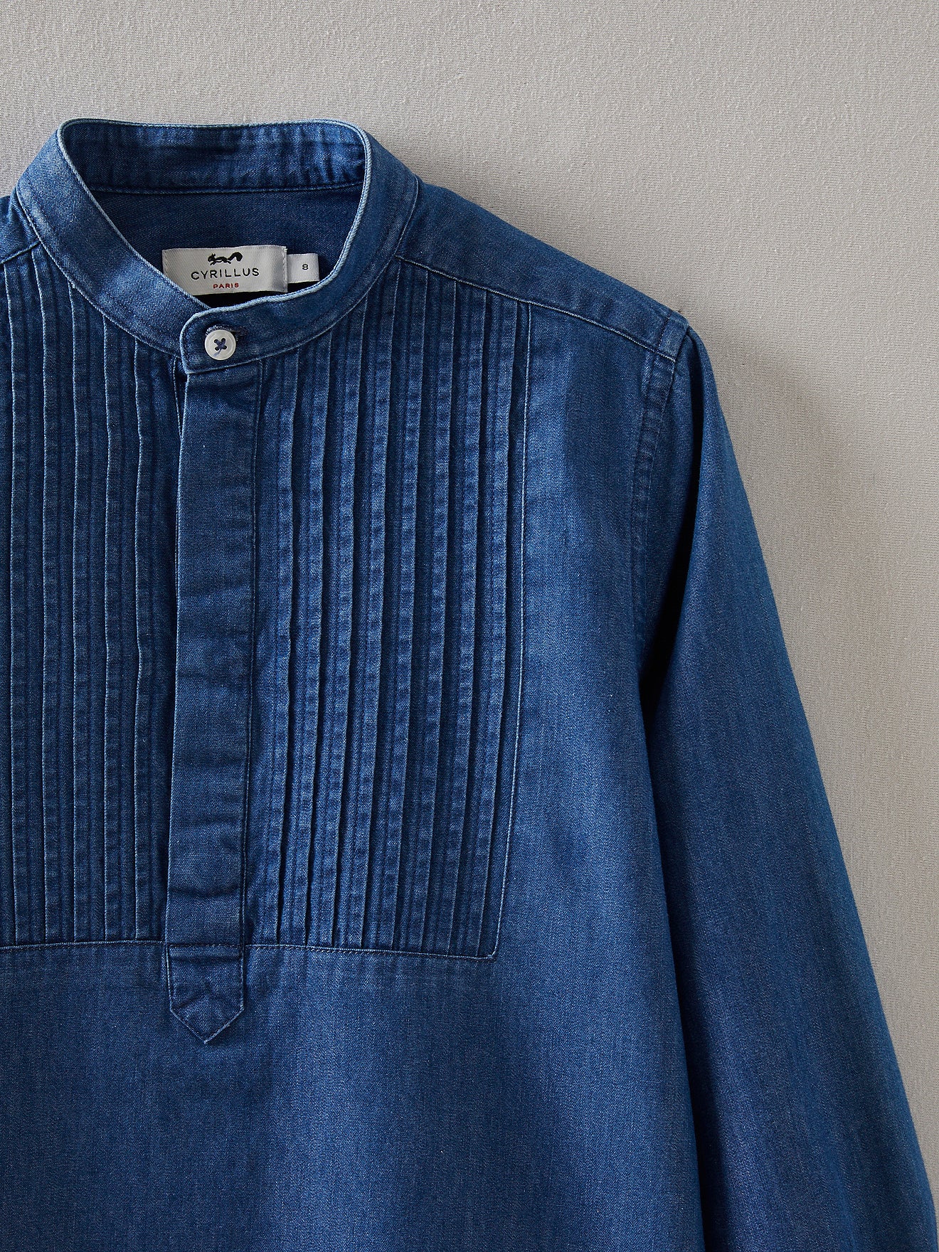 Travaillée dans un denim souple et léger, la chemise de cérémonie se démocratise sans perdre de son élégance. Un style worker retravaillé avec un plastron plissé et un col mao. Chic avec un pantalon classique, elle se porte aussi au quotidien pour un look casual et tendance.