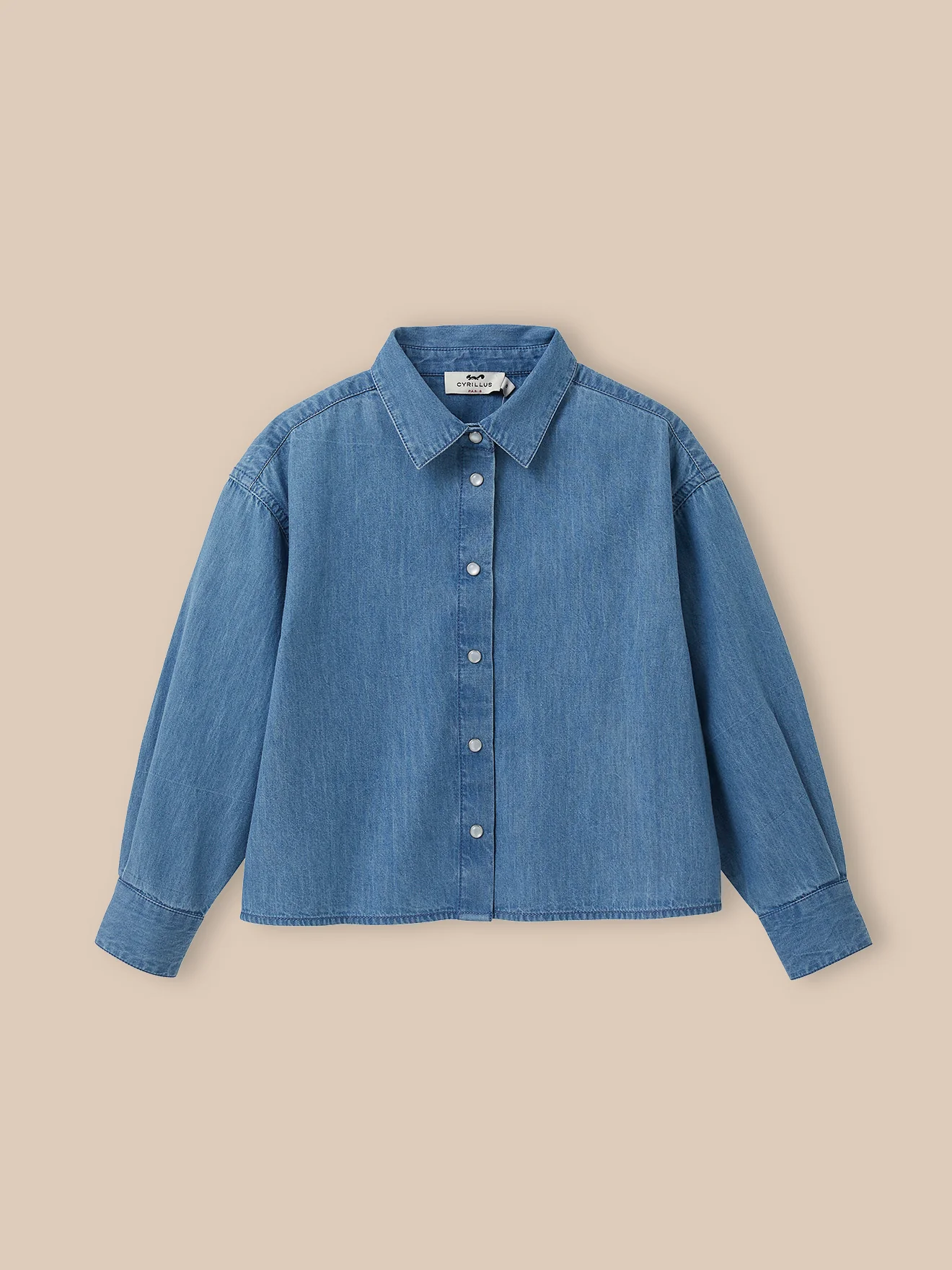 En denim light, cette chemise revisite les codes avec une coupe raccourcie et un volume oversize.