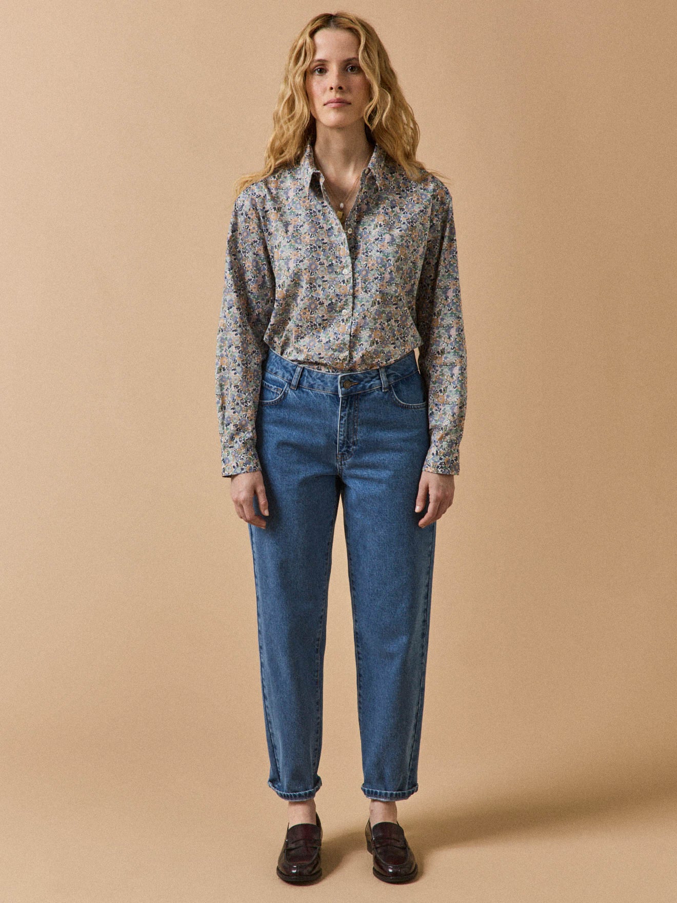 - Col chemise, patte de boutonnage, poche plaquée poitrine ; base arrondie ; long. milieu dos 67,5 cm (en taille 38)