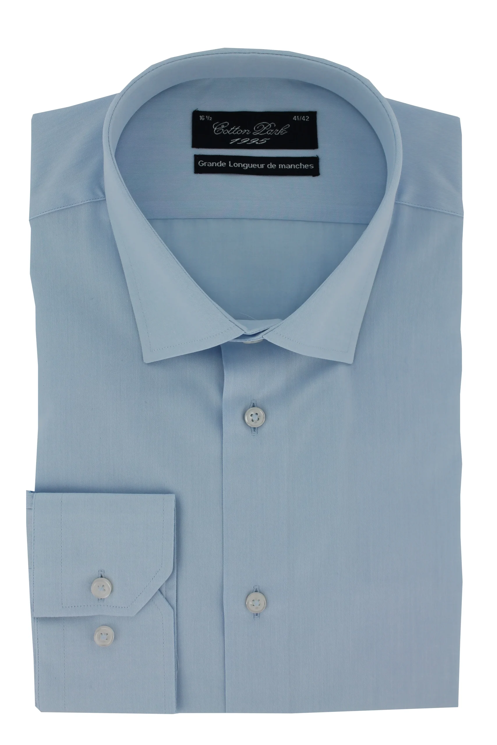 Chemise coupe droite pour homme en 100% coton bleu ciel. Cette chemise à grande longueur de manche est doté d’un col français et peut se porter avec ou sans cravate selon le style désiré. Son col a été confectionné de sorte à conserver sa rigidité dans le temps grâce à des baleines collées et intégrées. Les deux boutons présents au poignet vous permettront d’ajuster la taille de celui-ci au vôtre.