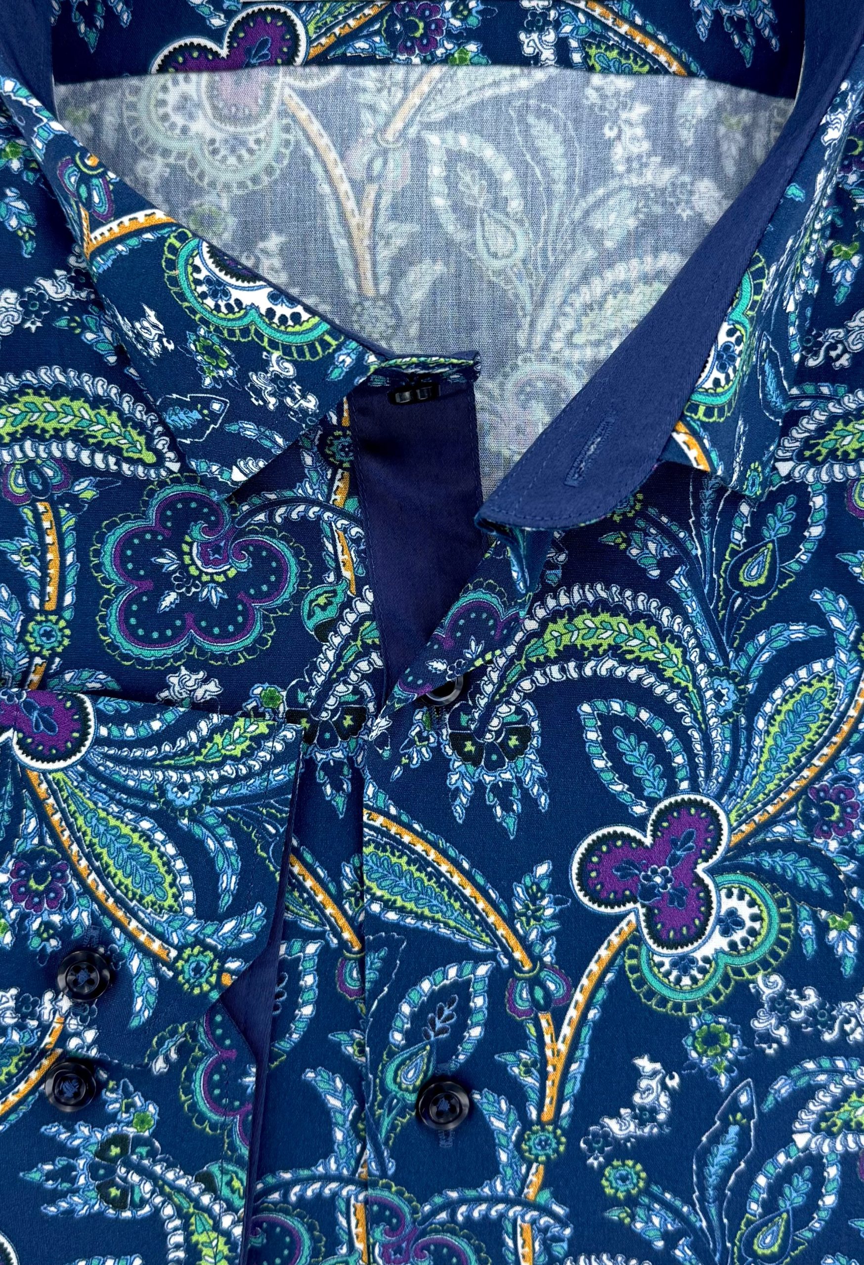 Ajoutez une touche de couleur et de style à votre dressing avec cette chemise en coton à motif pour homme. Motifs cachemire bleu et vert.