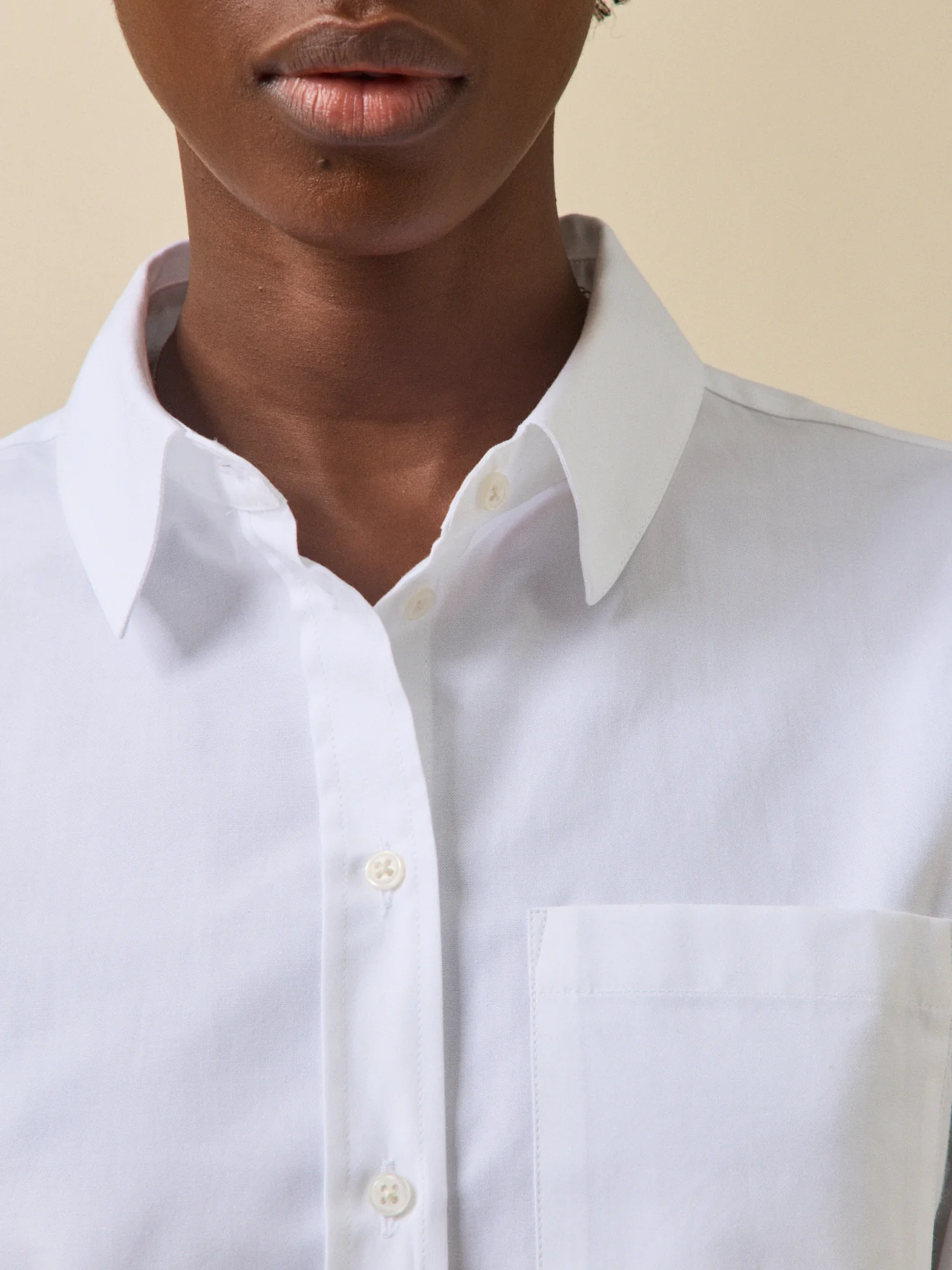 Tissu Oxford en coton biologique, blanc lumineux et volume ajusté : la chemise revisite les codes du chic. Une matière douce au tomber souple pour un classique qui ne manque pas de caractère.