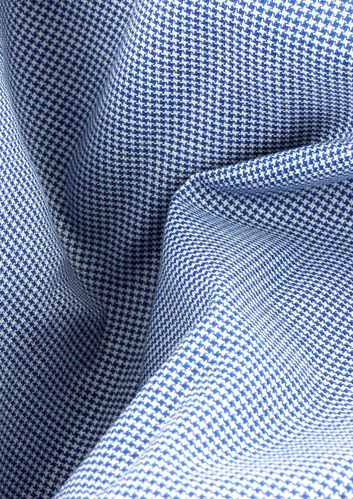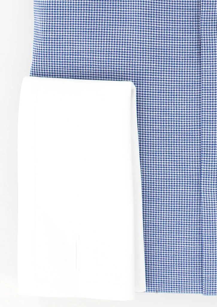 Raffinée et élégante, cette chemise pour homme à coupe droite est confectionnée dans un coton haut de gamme au motif pied-de-poule marine discret. Sans poche, elle présente un col blanc classique ou français et des poignets mousquetaires blancs, parfaitement coordonnés pour un rendu formel et distingué.
