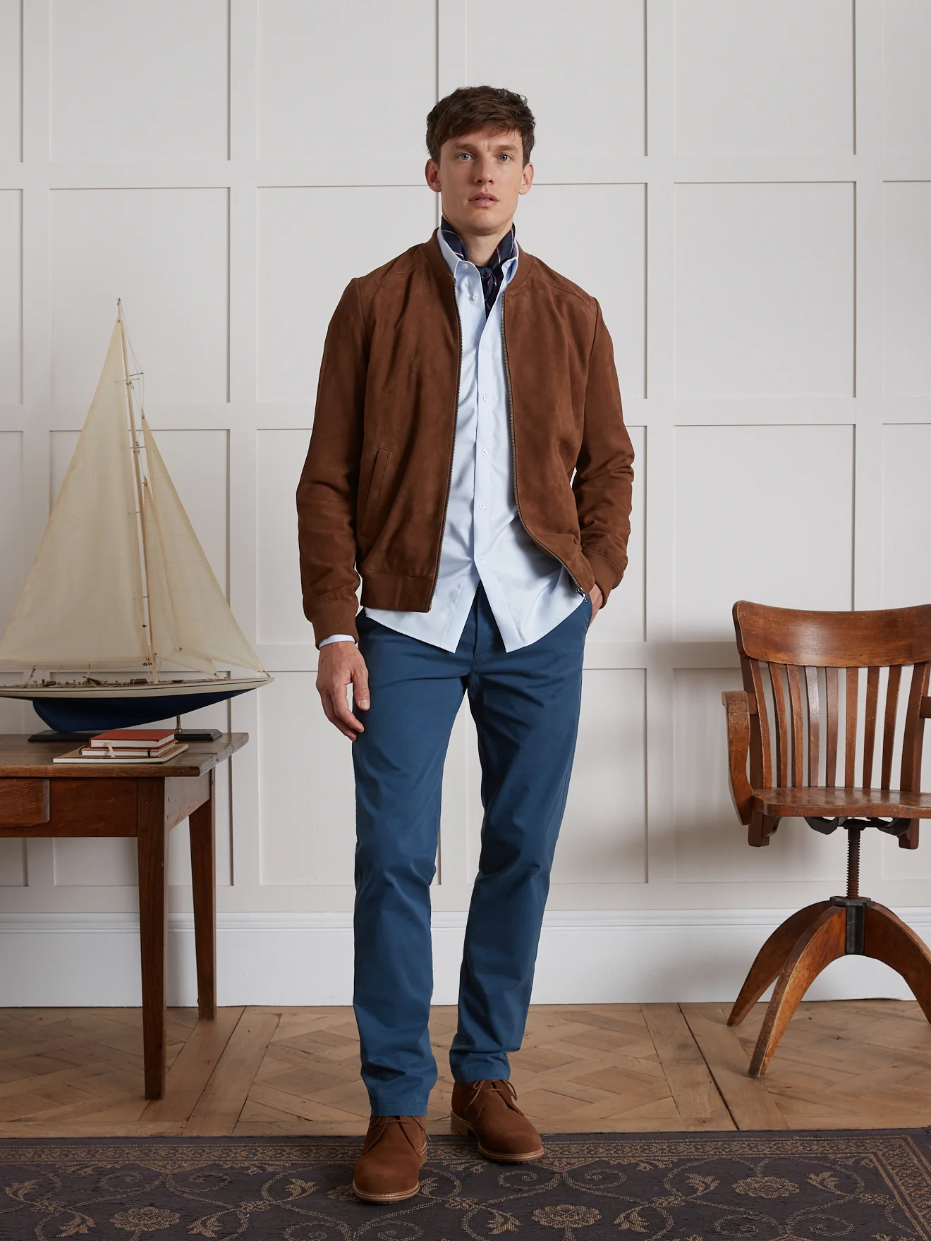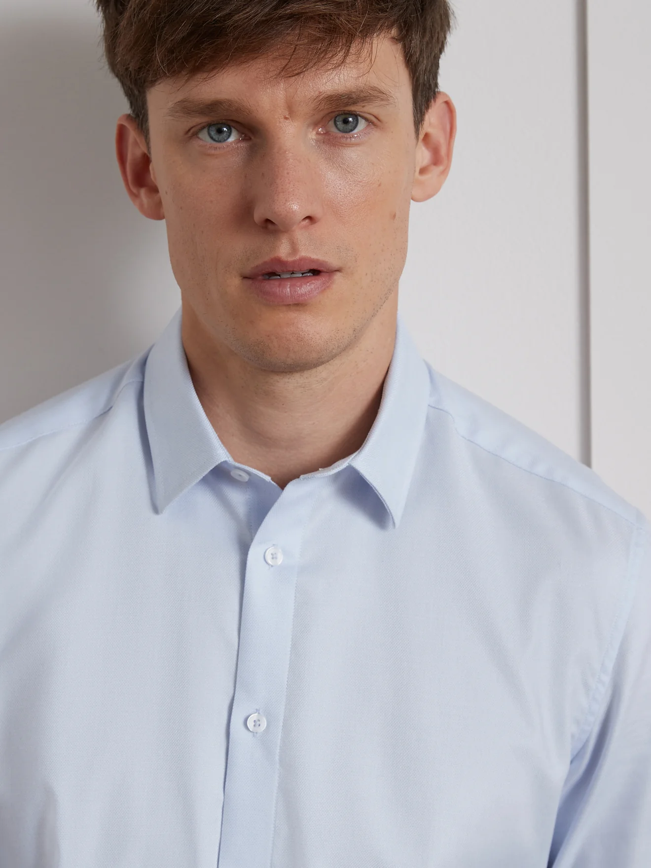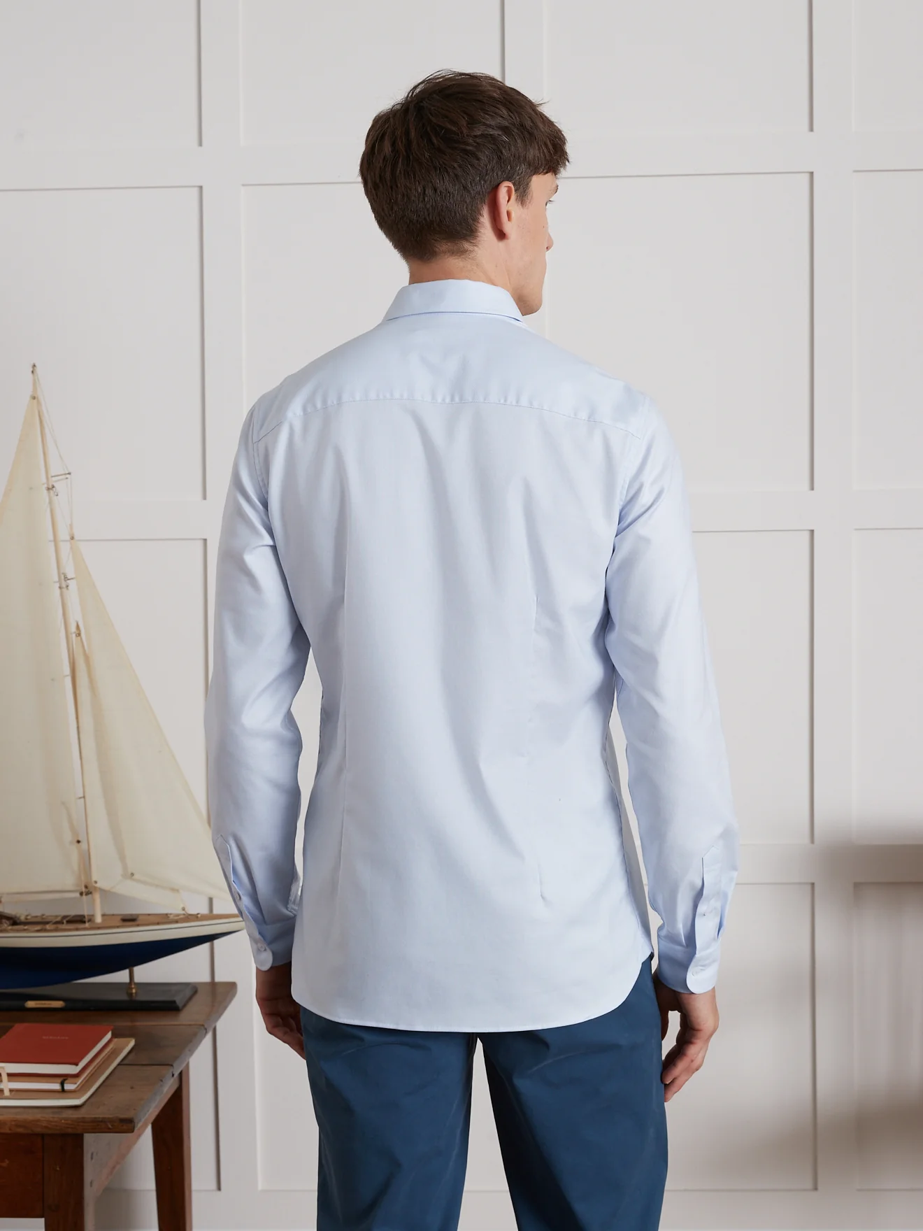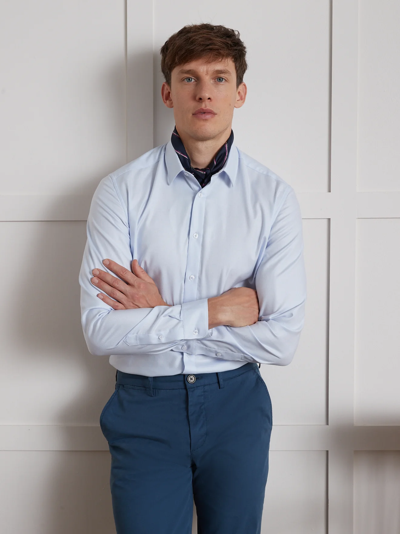 Bleu intemporel pour la chemise au chic urbain évident. Son coton pinpoint, léger et agréable à porter même quand il fait chaud, assure un confort et une tenue exemplaires. Coupe ajustée soulignant la silhouette, légèrement cintrée poitrine et taille, avec col français, patte de boutonnage et poignets arrondis.