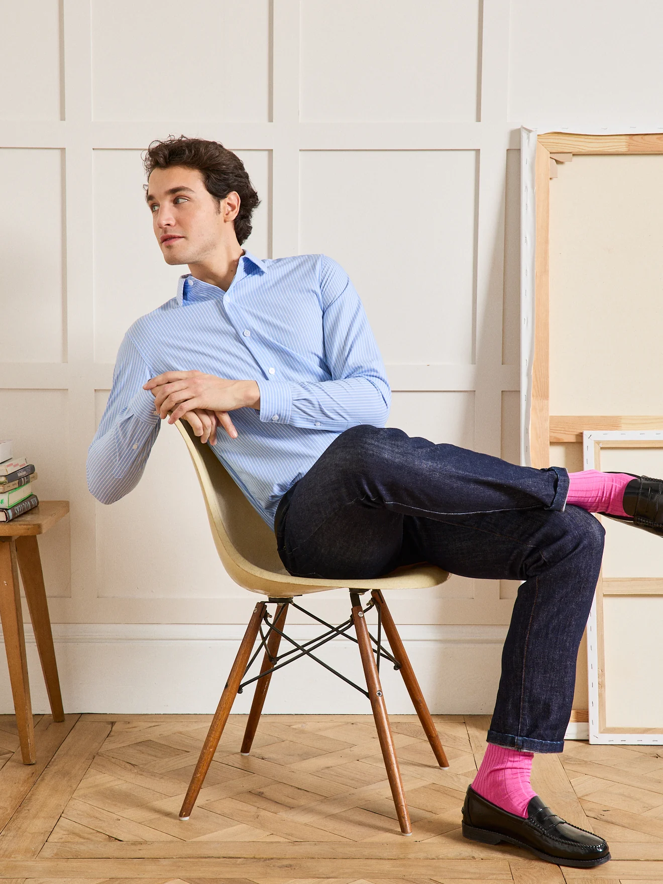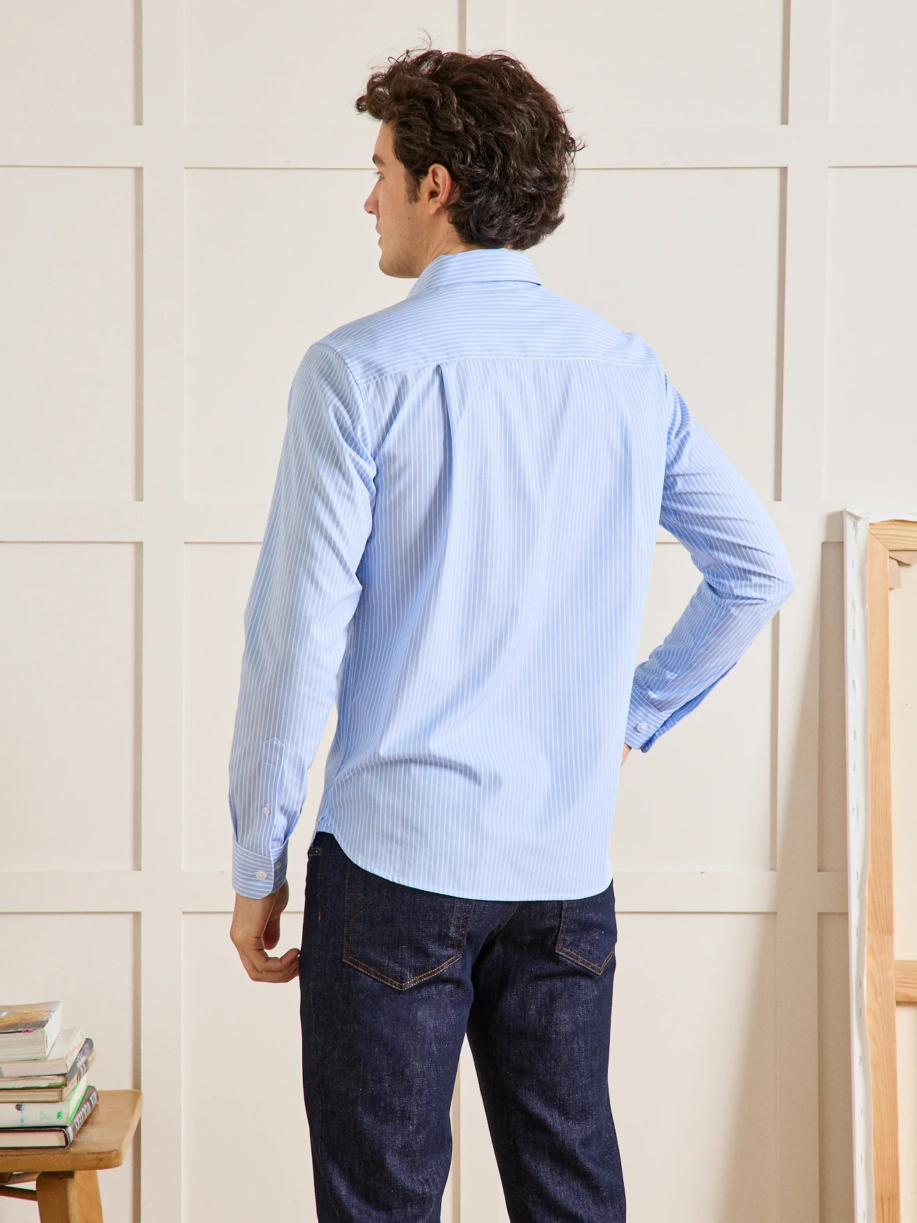 Aussi à l’aise sous un costume qu’avec un chino, la chemise rayée rehausse avec chic un style urbain classique et intemporel. Coupe ajustée soulignant la silhouette, légèrement cintrée poitrine et taille.