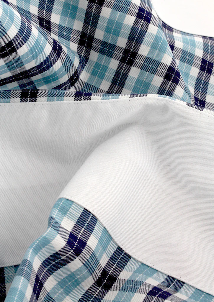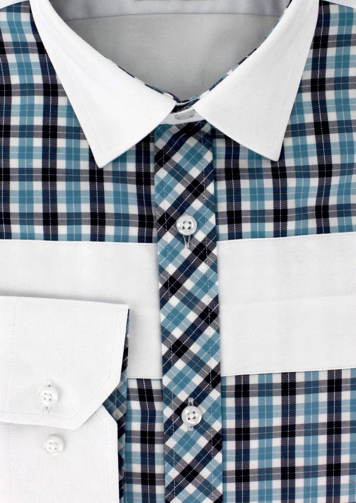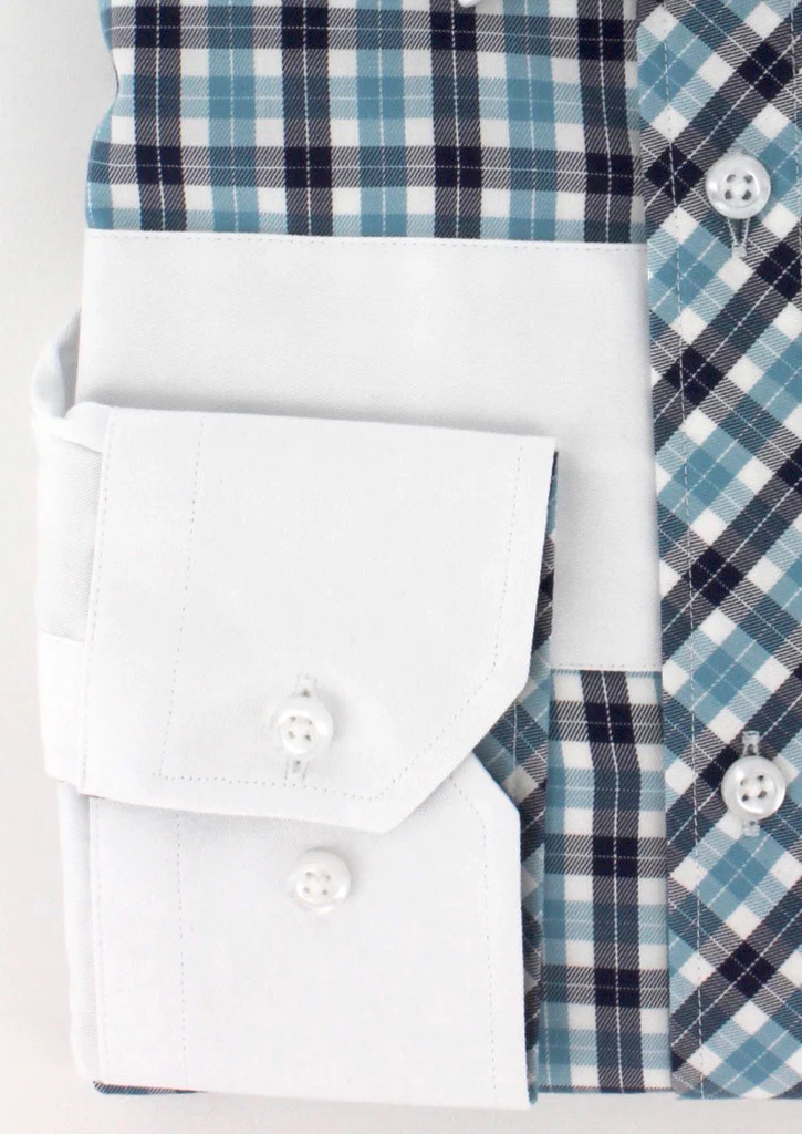Cette chemise est le résultat d’un assemblage parfait de deux motifs comprenant l’uni blanc et le carreaux de couleur turquoise et bleu marine. Les deux boutons présents au poignet vous permettront d’ajuster la taille de celui-ci au vôtre.