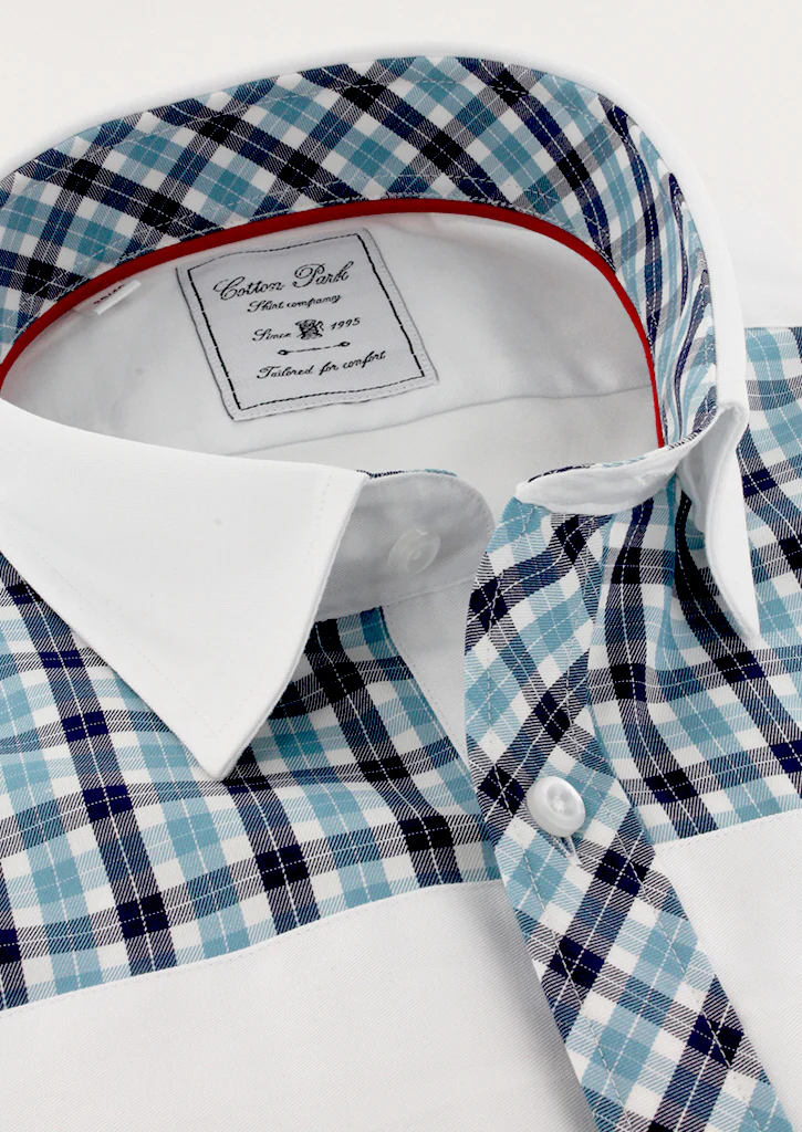 Chemise sport chic blanche à carreaux turquoise