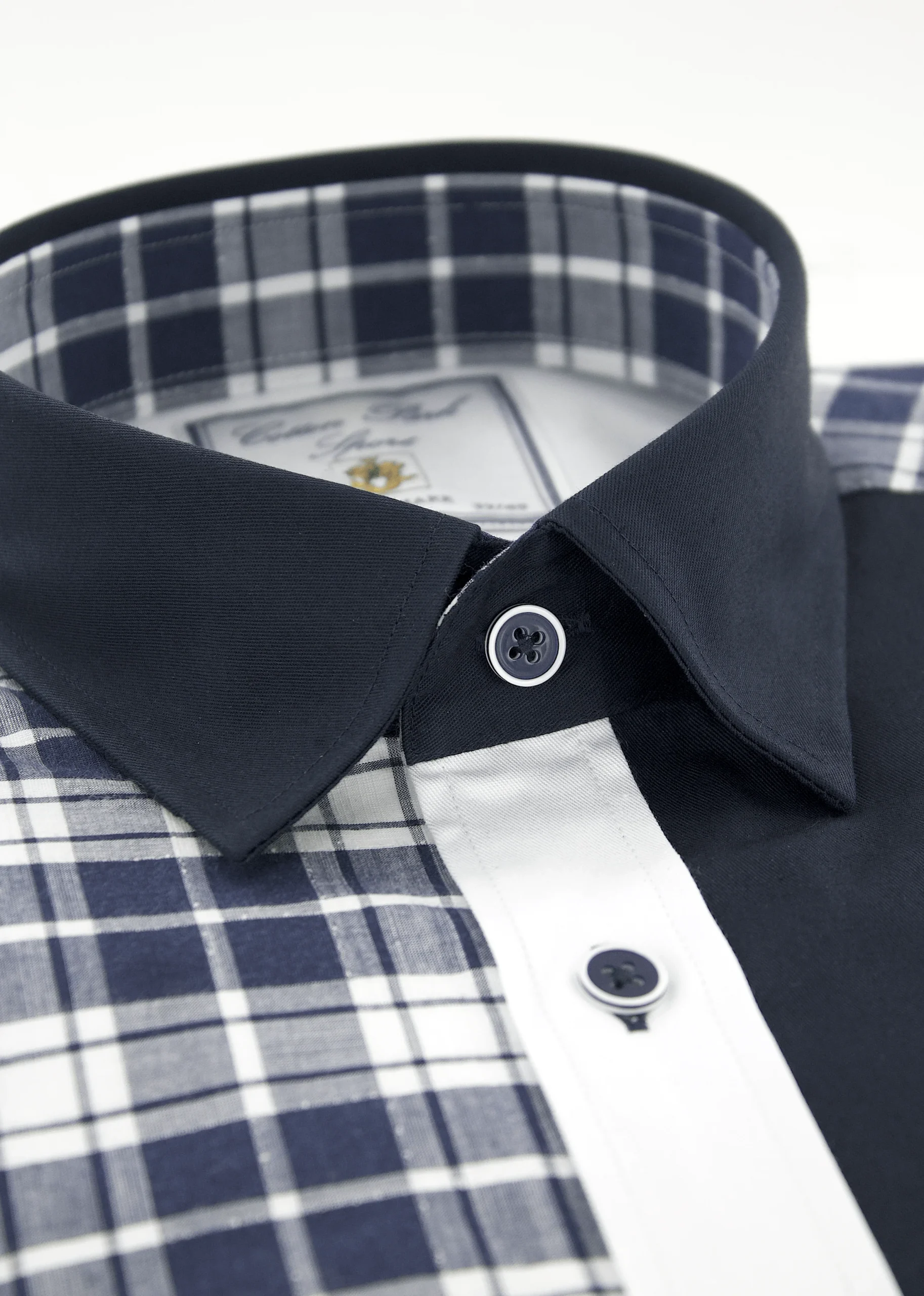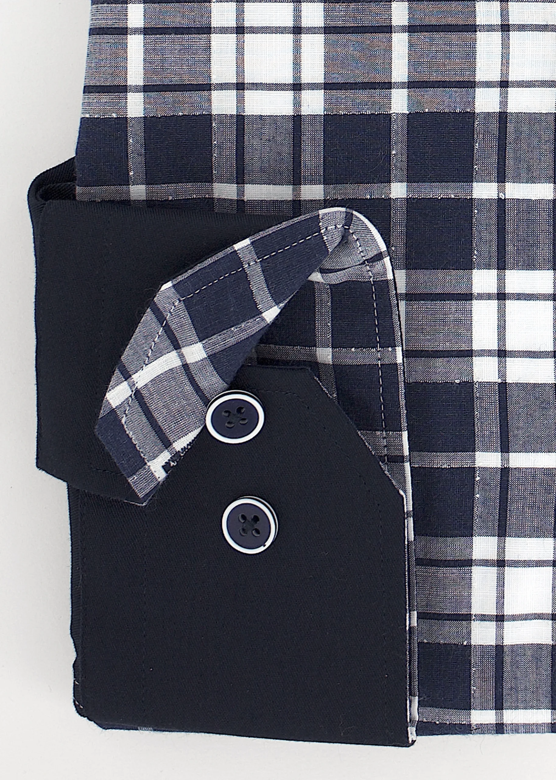 Cette chemise est le résultat d’un assemblage parfait de deux motifs comprenant l’uni blanc et carreaux de couleur bleu marine. Les deux boutons présents au poignet vous permettront d’ajuster la taille de celui-ci au vôtre.