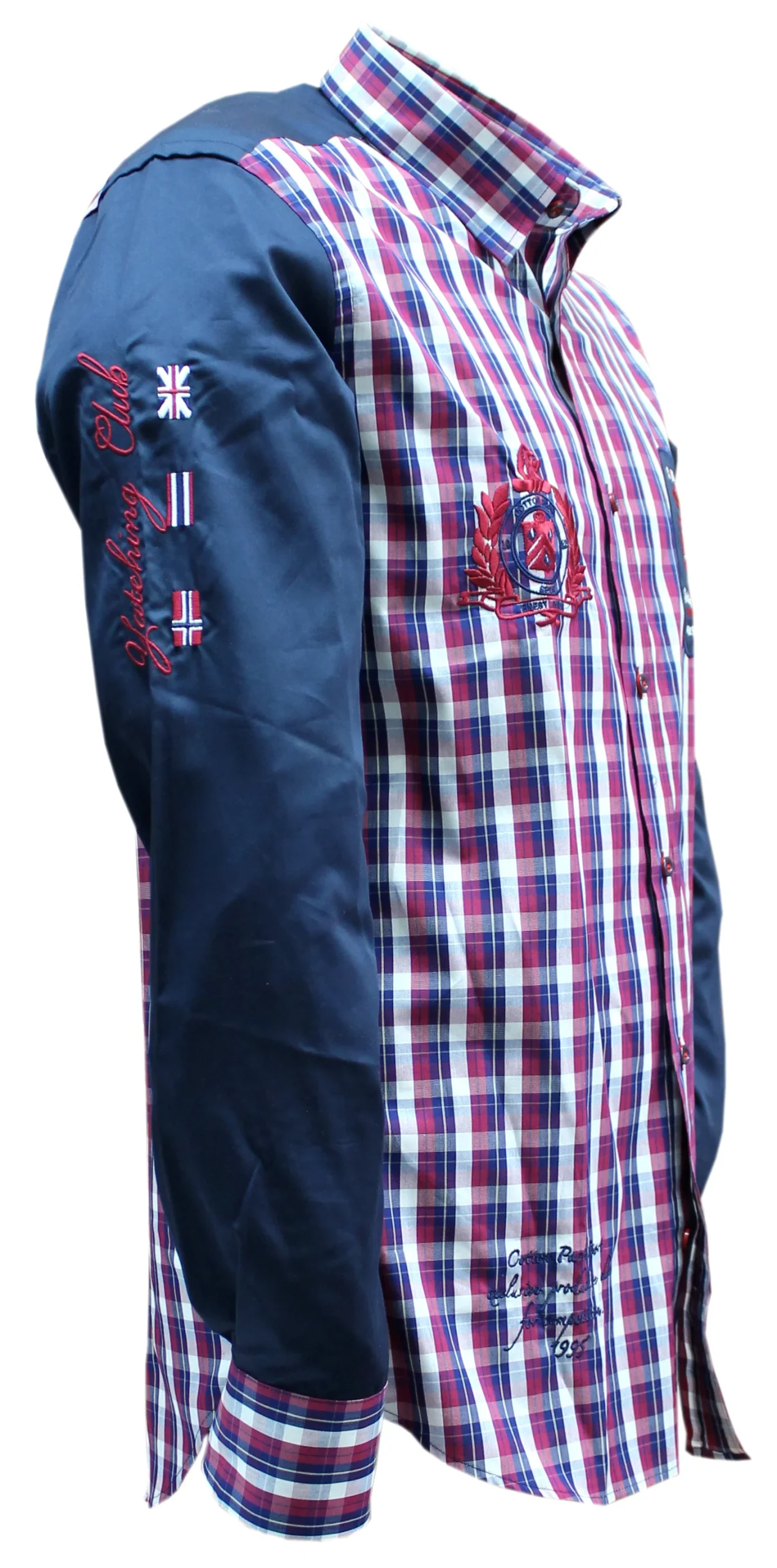 Cette chemise est le résultat d’un assemblage parfait d’un motif à carreaux rouge au torse et d’une couleur unie bleu marine aux épaules. Les deux boutons présents au poignet vous permettront d’ajuster la taille de celui-ci au vôtre.