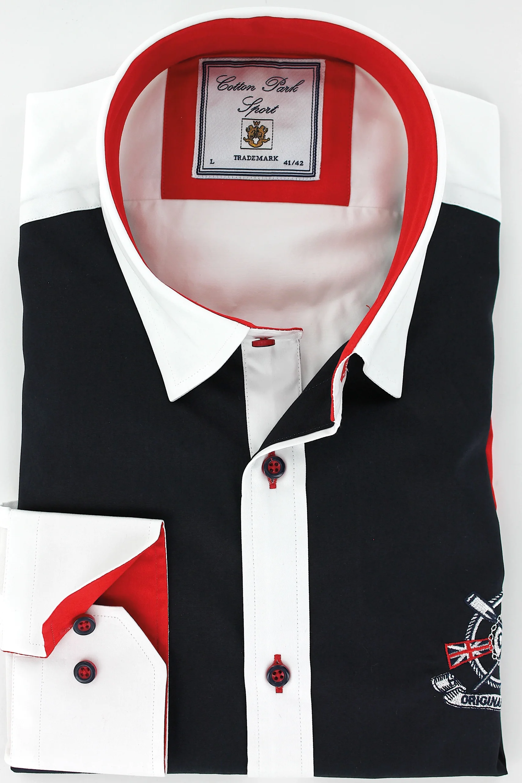 Chemise sport chic marine bande diagonale rouge brodée
