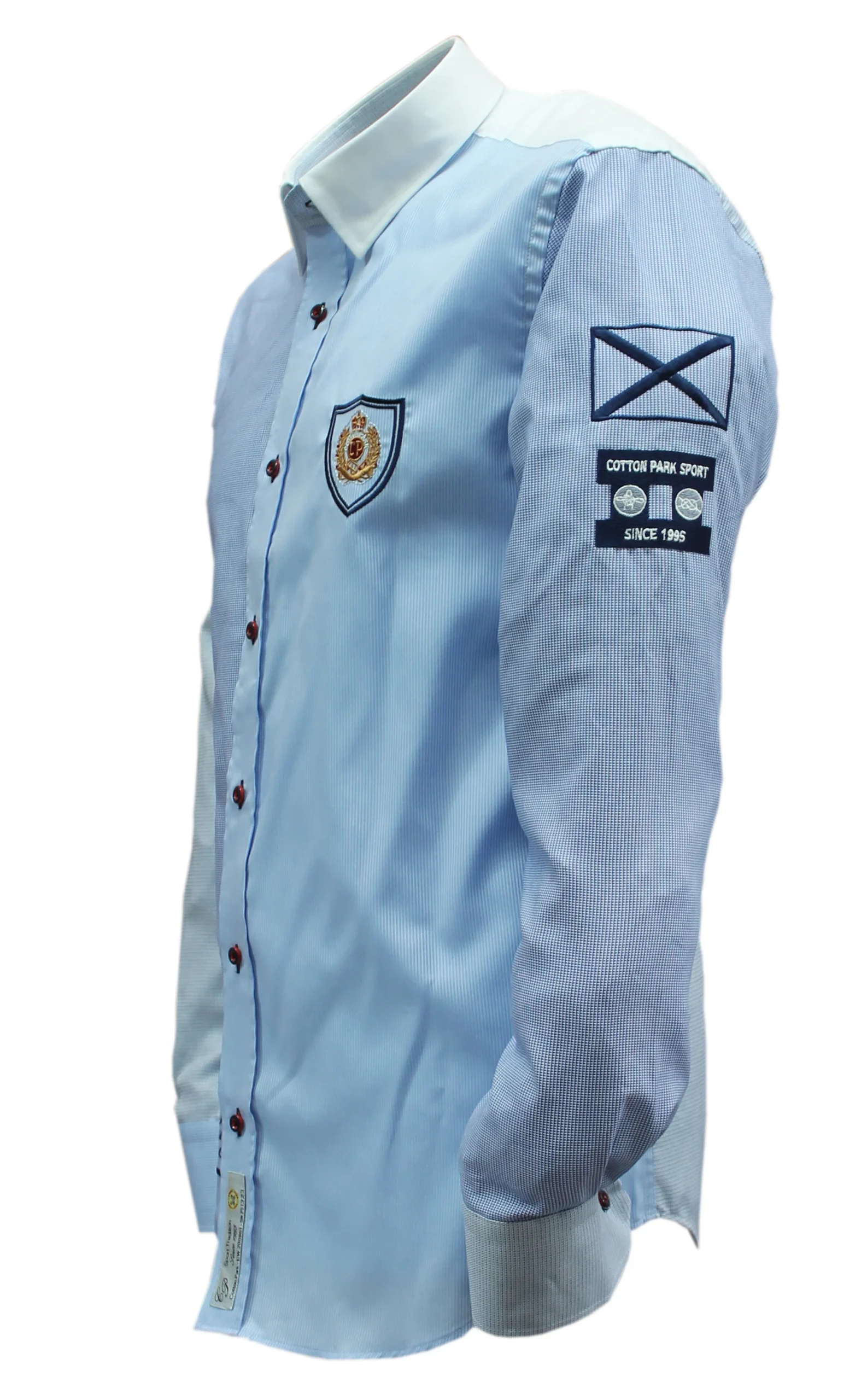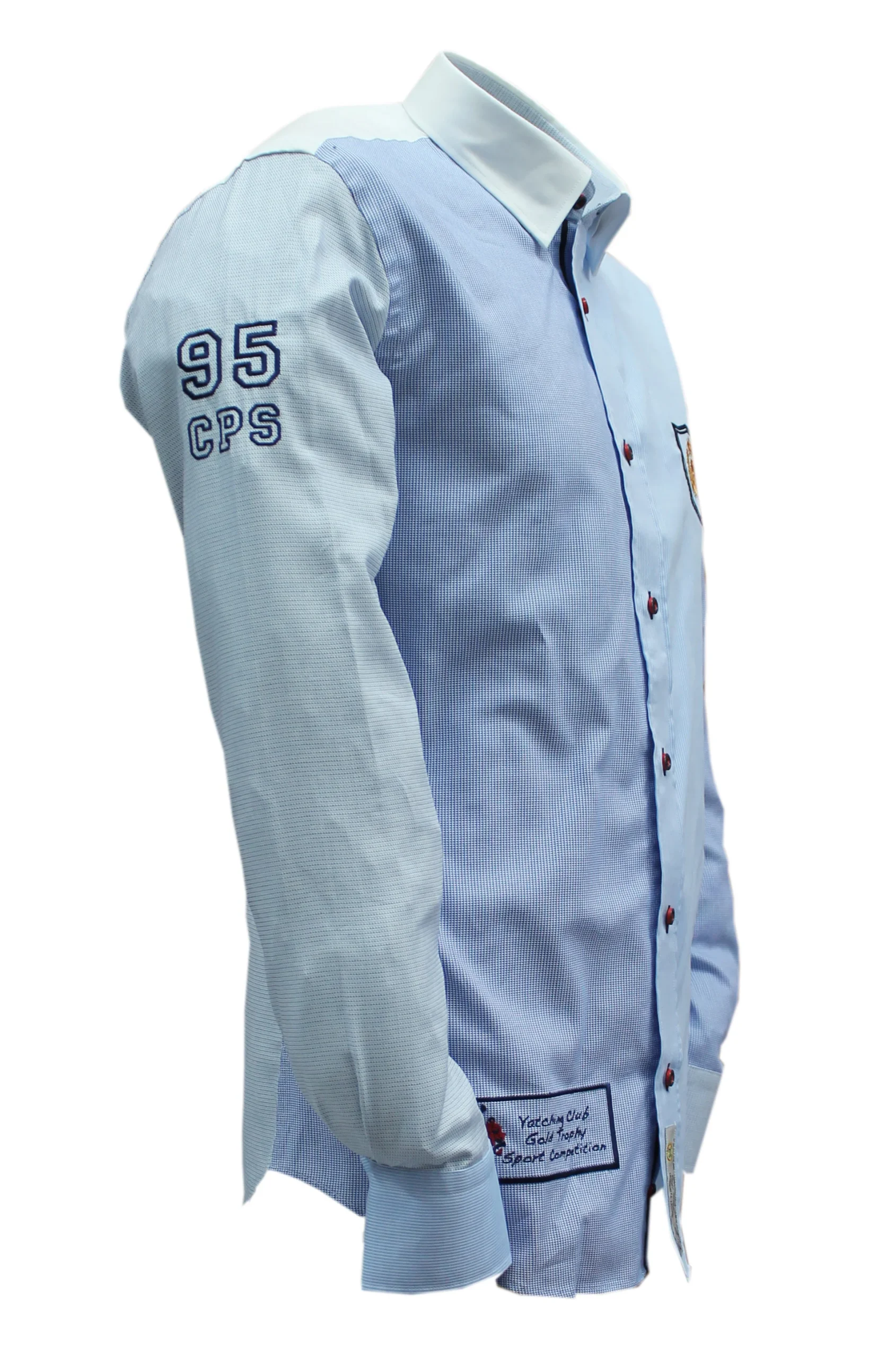 Cette chemise est le résultat d’un assemblage parfait de tissus comprenant carreaux et rayures de couleur bleu ciel. Les deux boutons présents au poignet vous permettront d’ajuster la taille de celui-ci au vôtre. Souplesse et bonne tenue sont le fruit d’une confection irréprochable du col boutonné sous patte présent sur cette chemise. Les broderies sur les manches et au niveau de la poitrine amène un côté sport à la chemise.