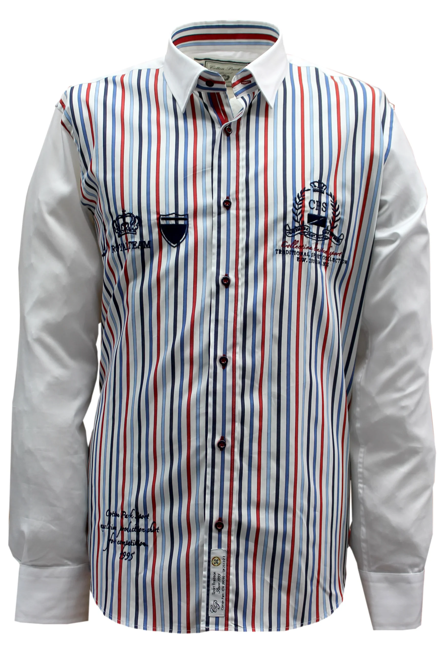 Cette chemise est le résultat d’un assemblage parfait d’un motif à rayures bleu et rouge au torse et d’une couleur unie blanc aux épaules. Les deux boutons présents au poignet vous permettront d’ajuster la taille de celui-ci au vôtre.