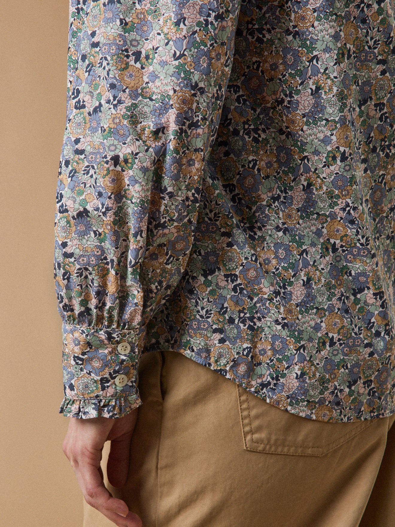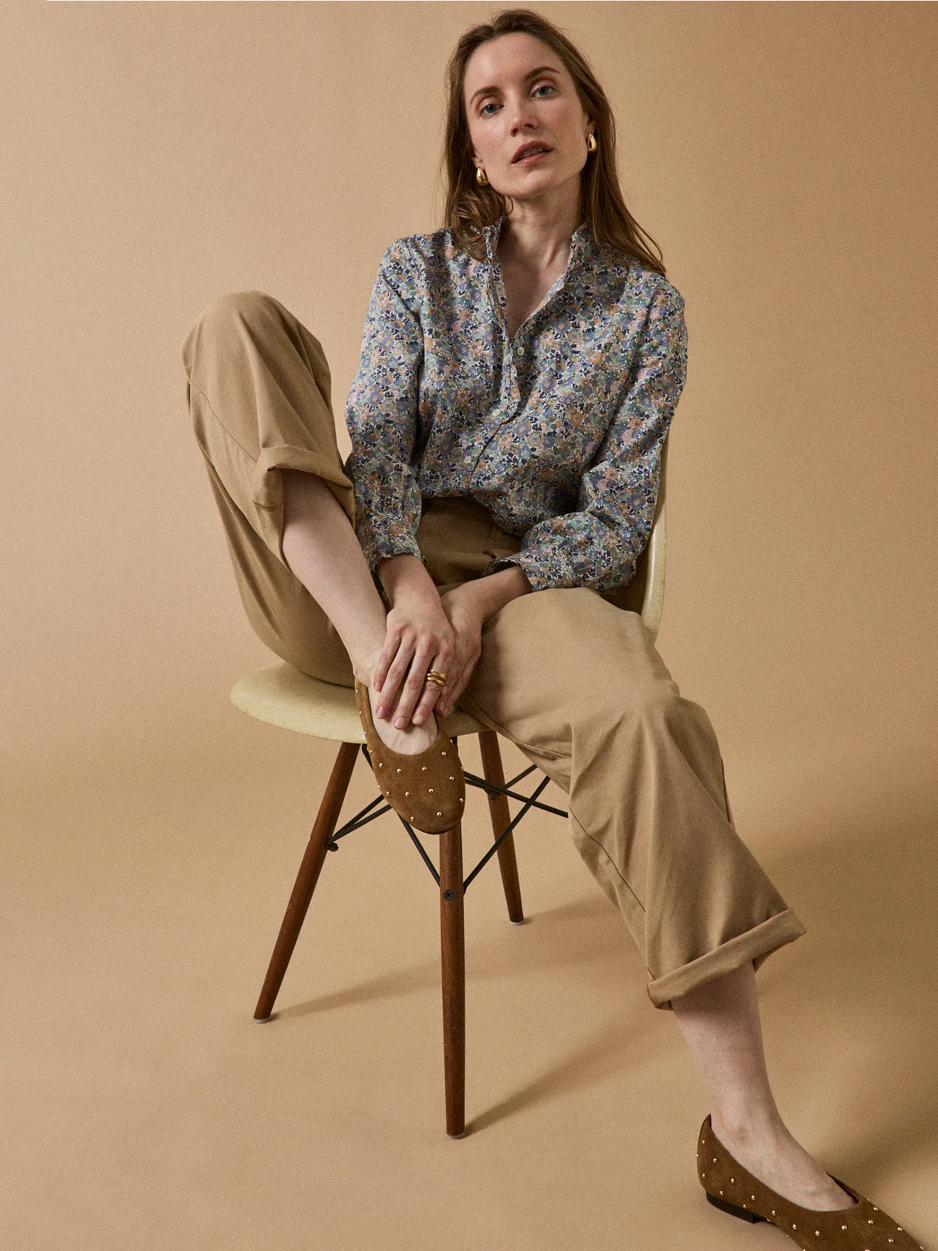 - Finition volantée au col rond et le long d’une partie de la patte de boutonnage ; fronces sous découpes épaules et dos