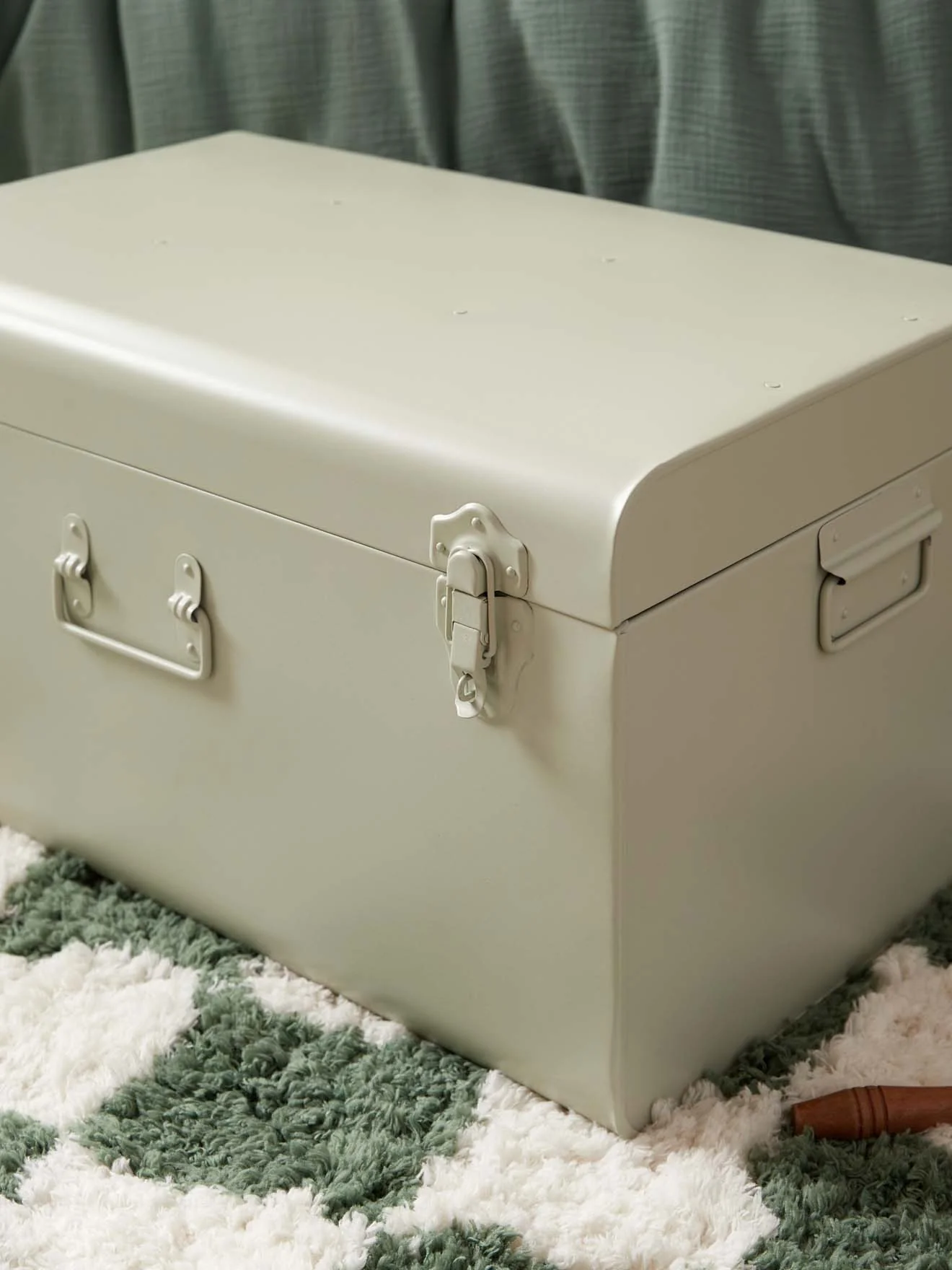 Grande malle en métal avec 3 poignées et 2 fermoirs à levier. Un rangement déco, fabriqué en Inde, à l’allure rétro-industrielle.