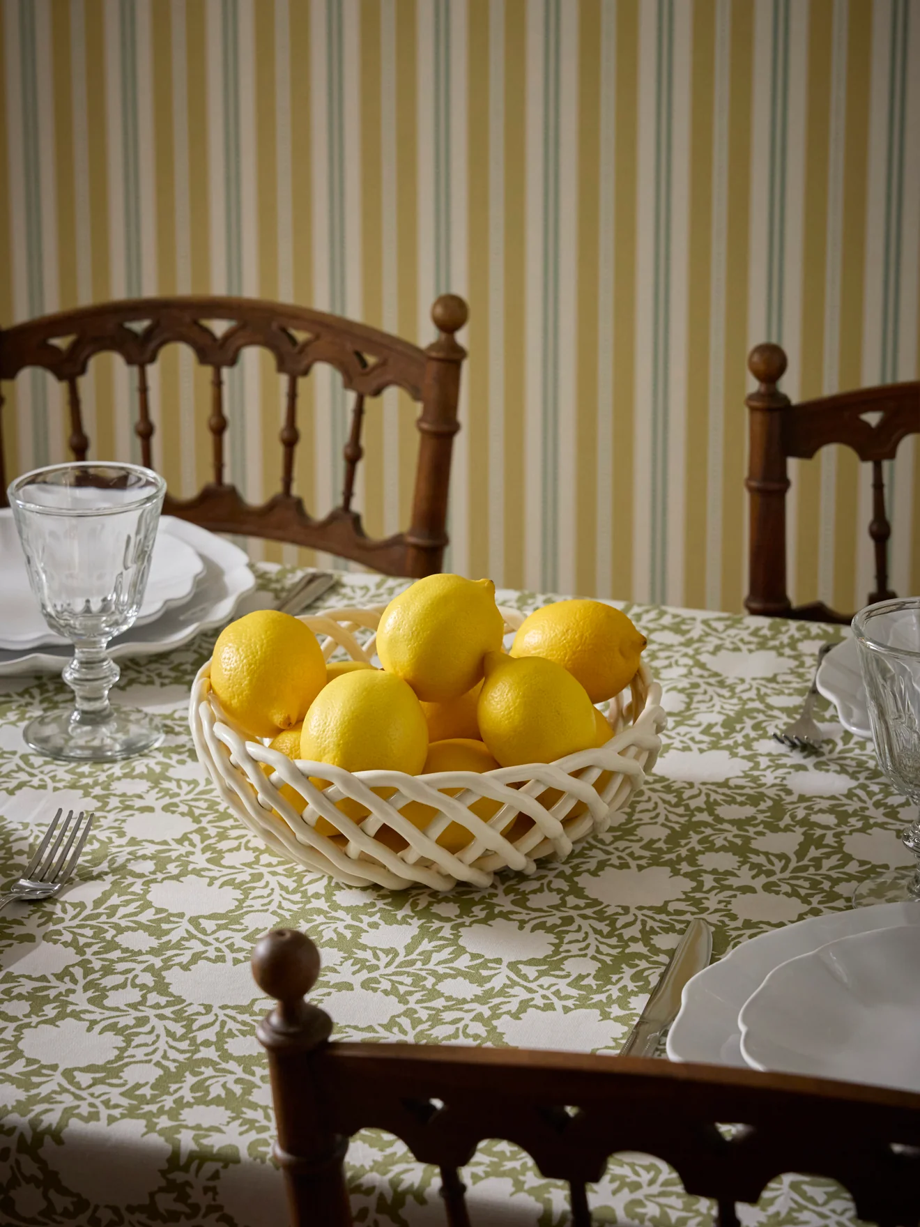 Corbeille tressée en céramique peinte finition brillante. Élégante et originale, elle a aussi l’avantage de pouvoir se nettoyer au lave-vaisselle.