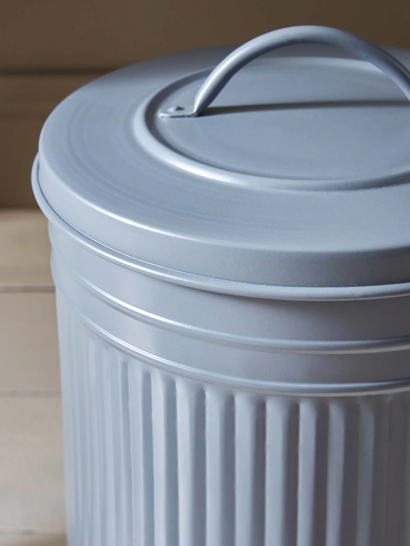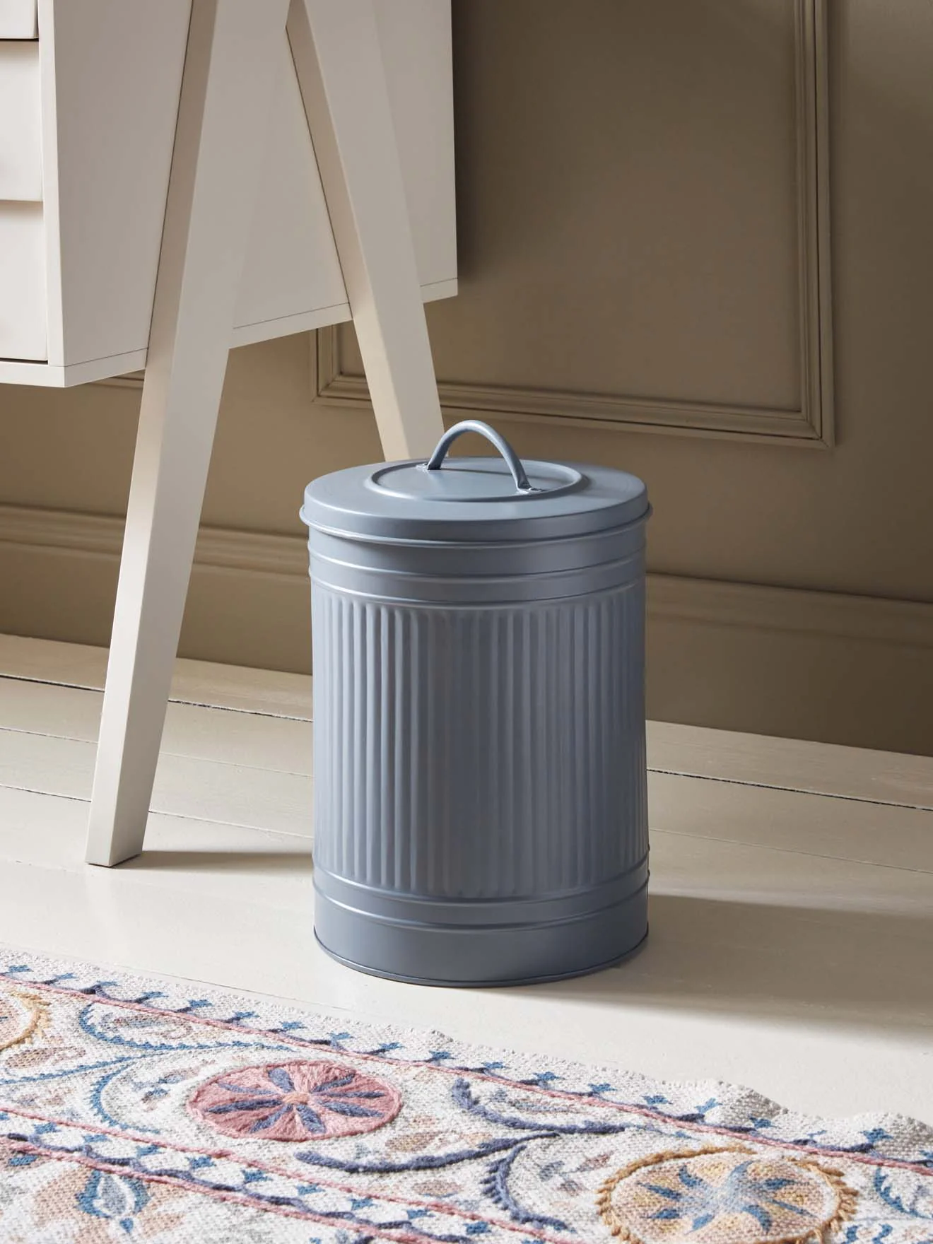 Poubelle en métal avec couvercle à poignée. Idéale au pied d’un bureau ou dans la salle de bain.