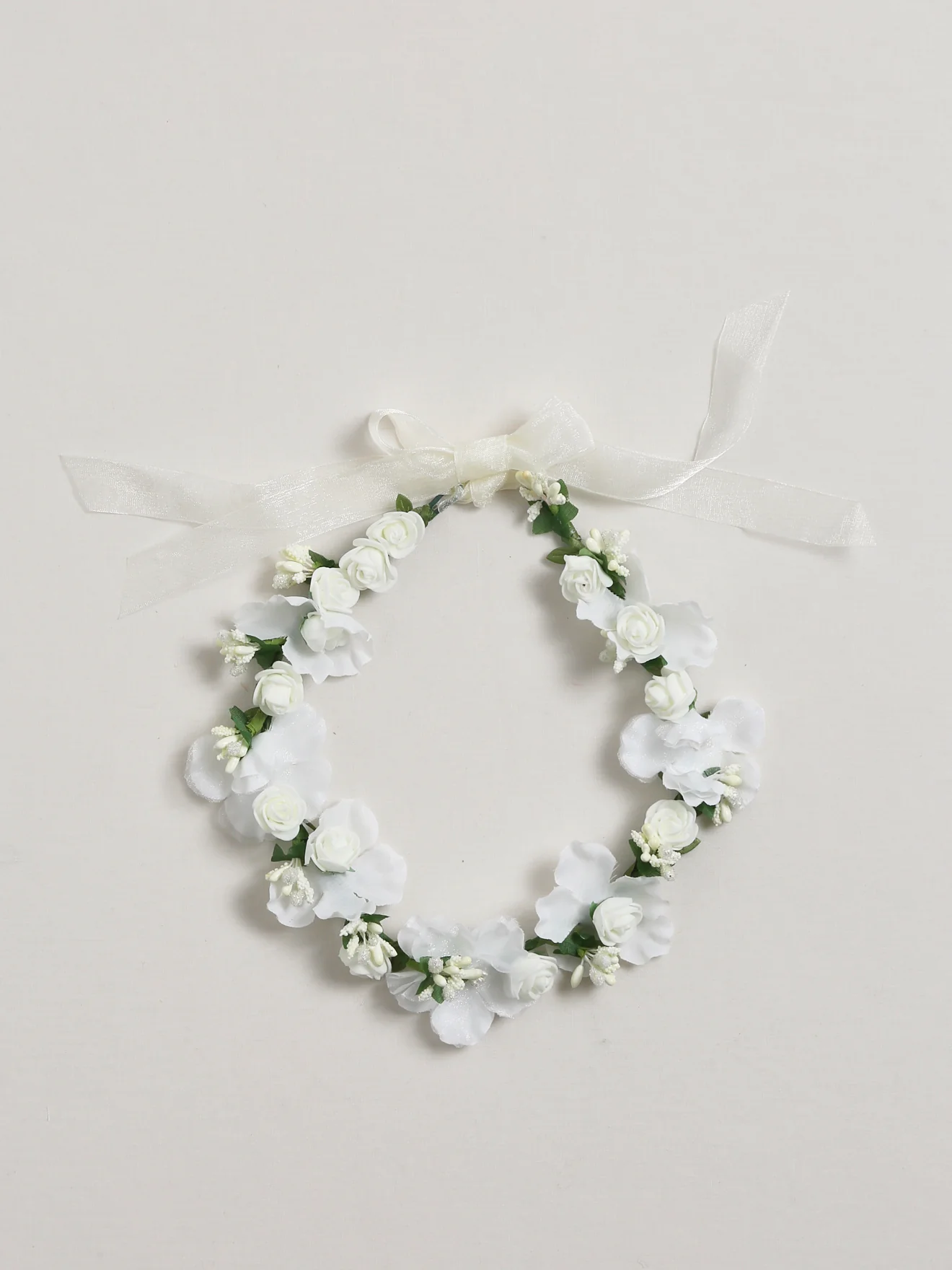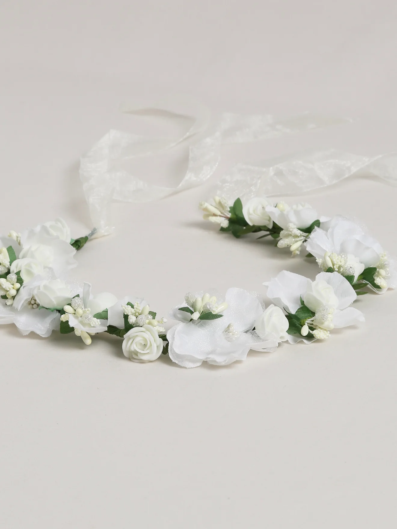 La couronne de fleurs blanches, raffinée à nouer tendrement sur une coiffure naturelle ou plus travaillée. Liens en dentelle