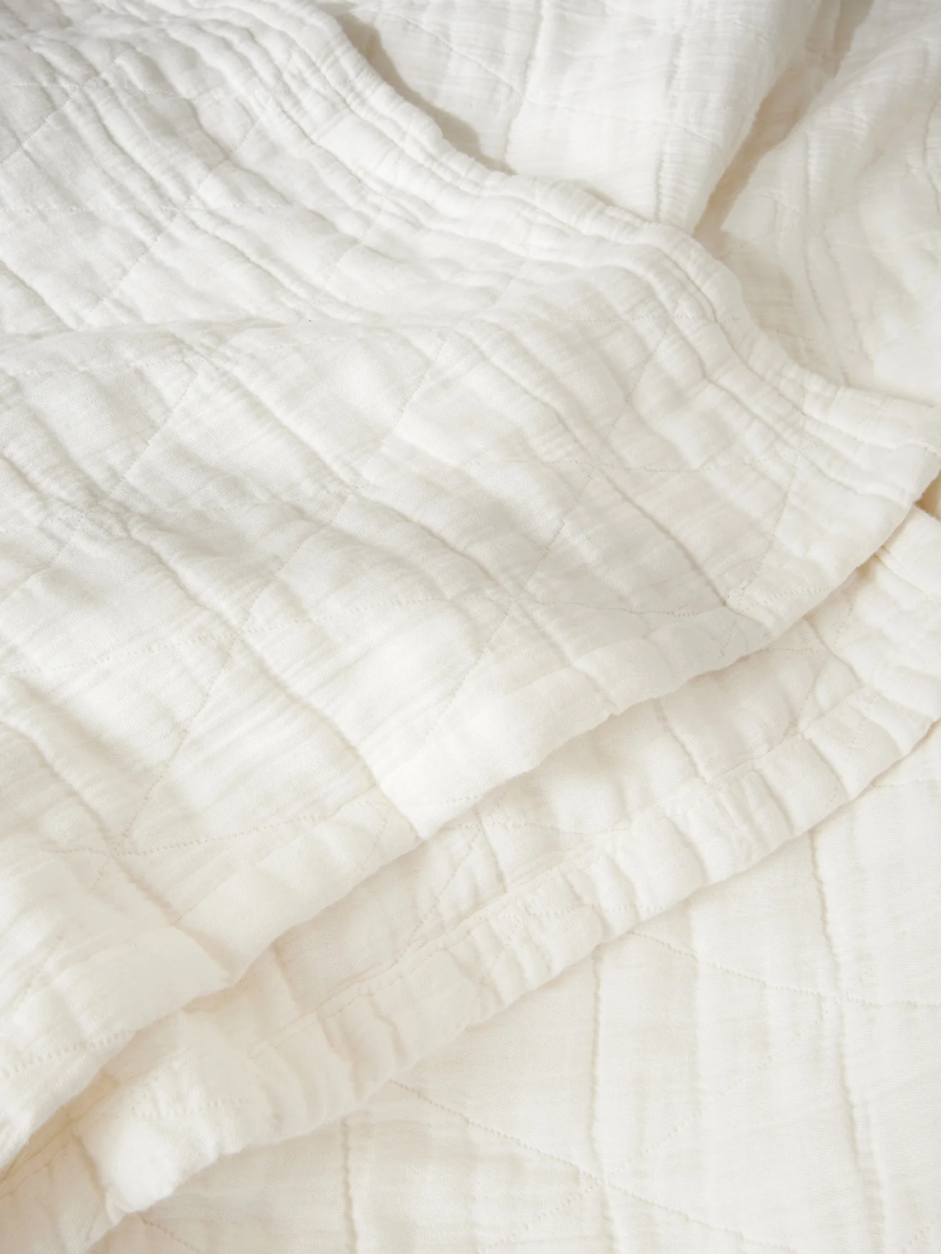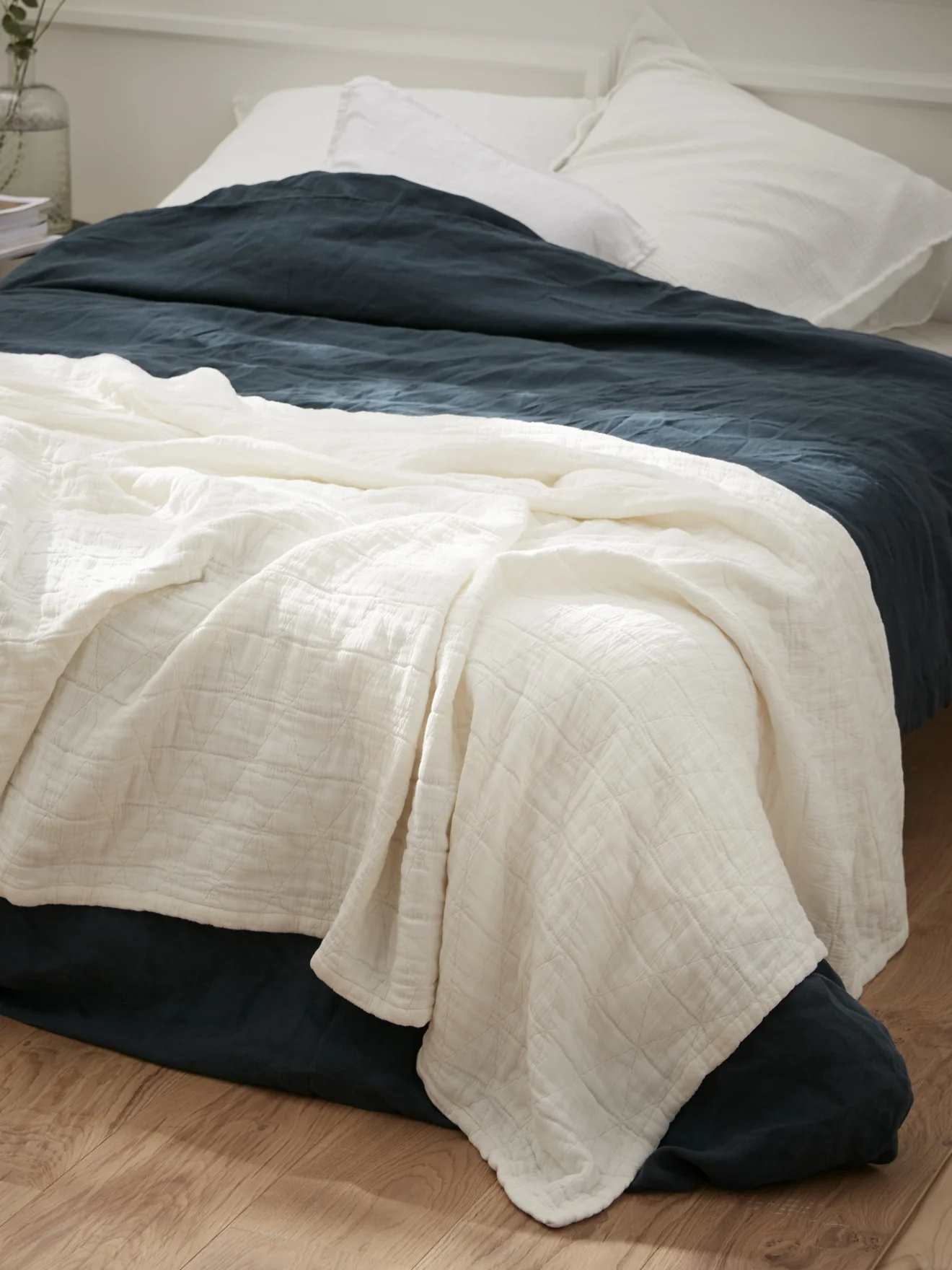 Plaid ou couvre-lit en coton piqué fabriqué au Portugal. Les piqûres façon quadrillage ou losanges lui procurent une élégance épurée et un effet volume aérien.