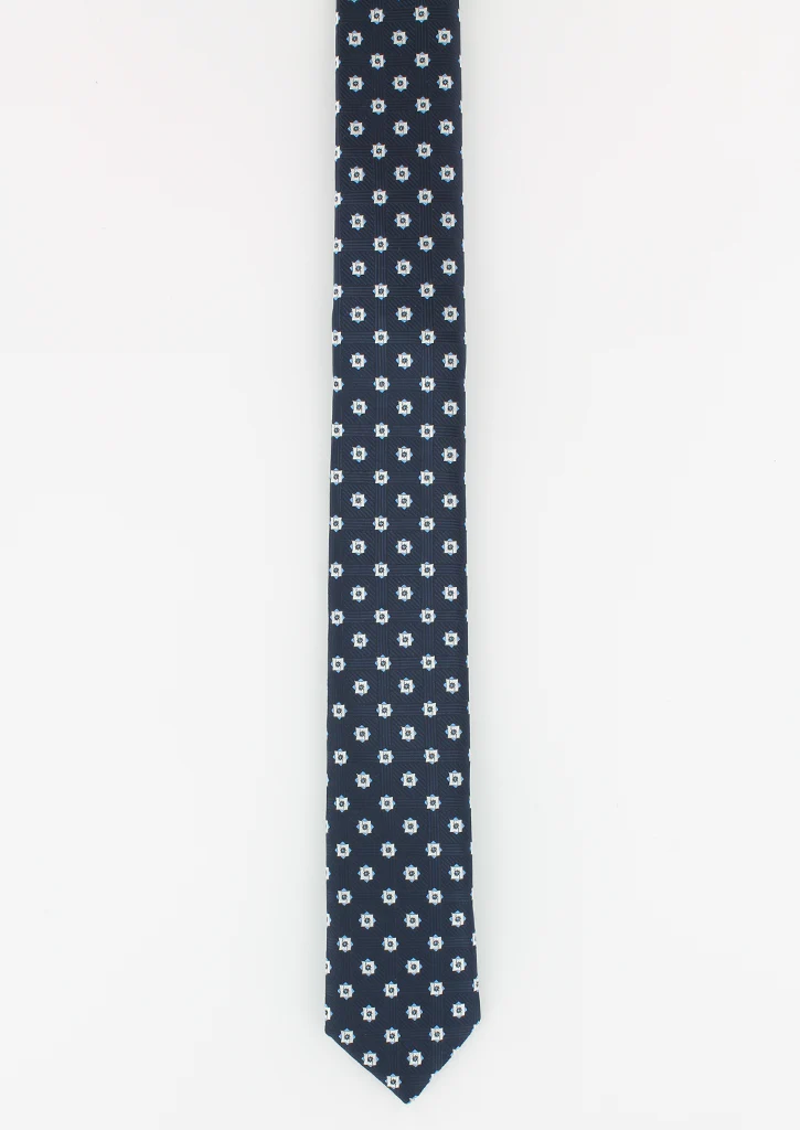 Cravate fine en soie bleu marine motifs à fleurs blanc. Cravate Cotton Park d’une largeur de 5 cm et d’une longueur de 148 cm. Nettoyage à sec. Article CR7112/ACC – CRFBMFB CARACTÉRISTIQUES Largeur de 5 cm 100% soie Taille: 148 cm Nettoyage à sec.