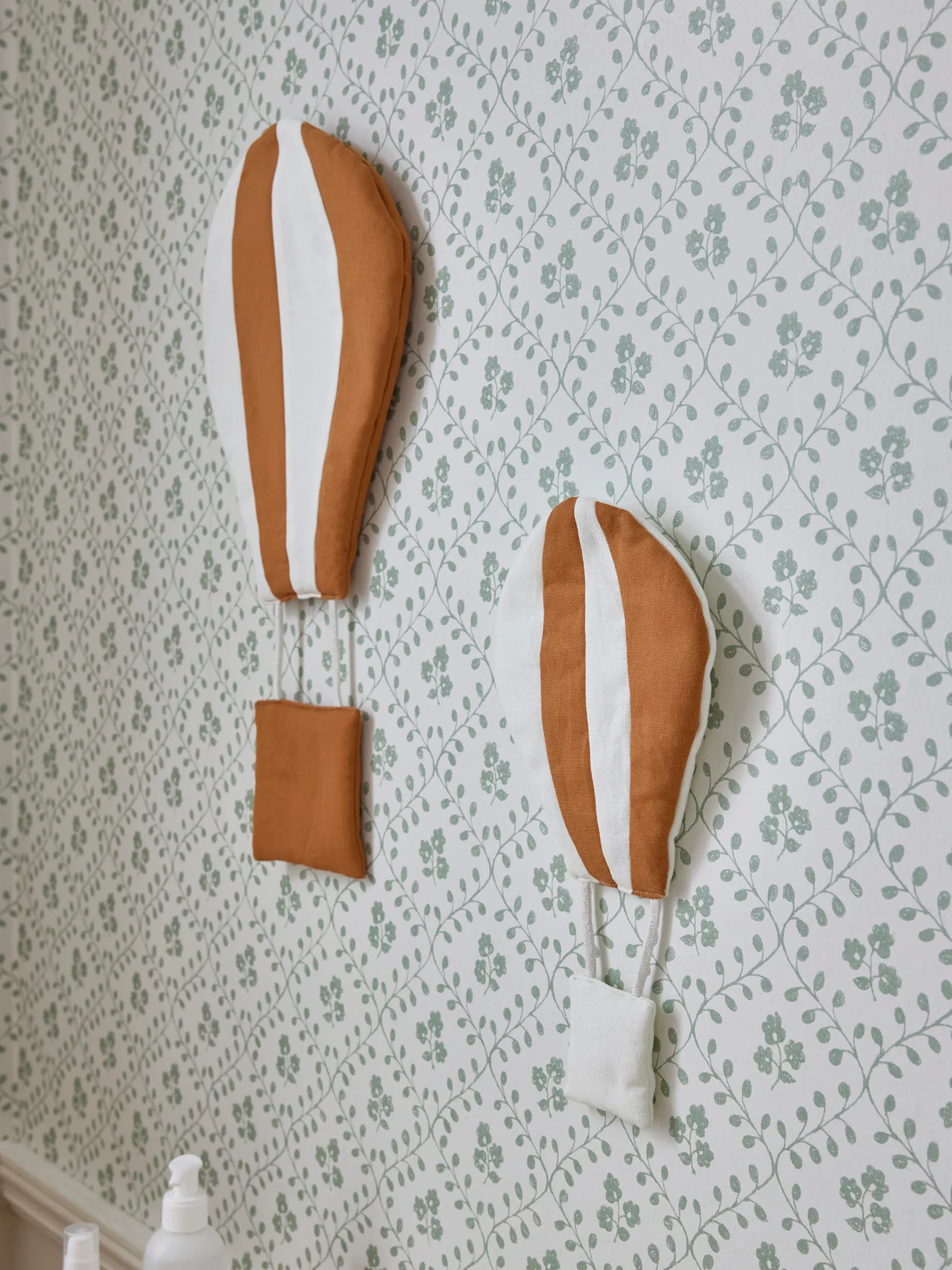 Lot de 2 montgolfières en coton molletonné de tailles différentes. Déco murale originale et élégante. Se fixent à l’aide d’une petite encoche au dos.