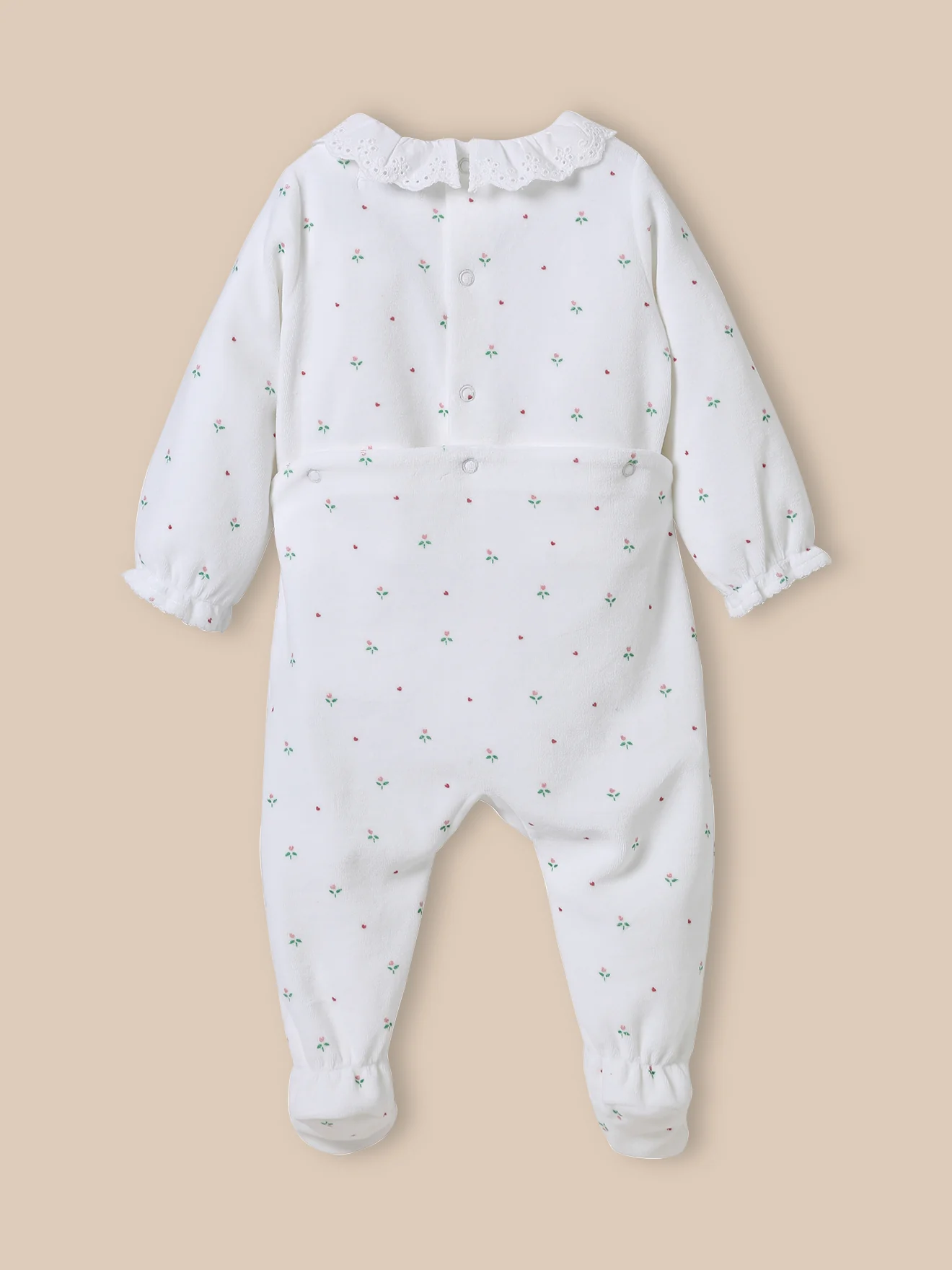 Un dors-bien en velours doux, délicatement parsemé de petites fleurs colorées. Le col en broderie anglaise ajoute une touche de charme rétro. Un parfait cadeau de naissance. Col en broderie anglaise Poignets élastiqués effet froufrou Ouverture dos et pont par pressions