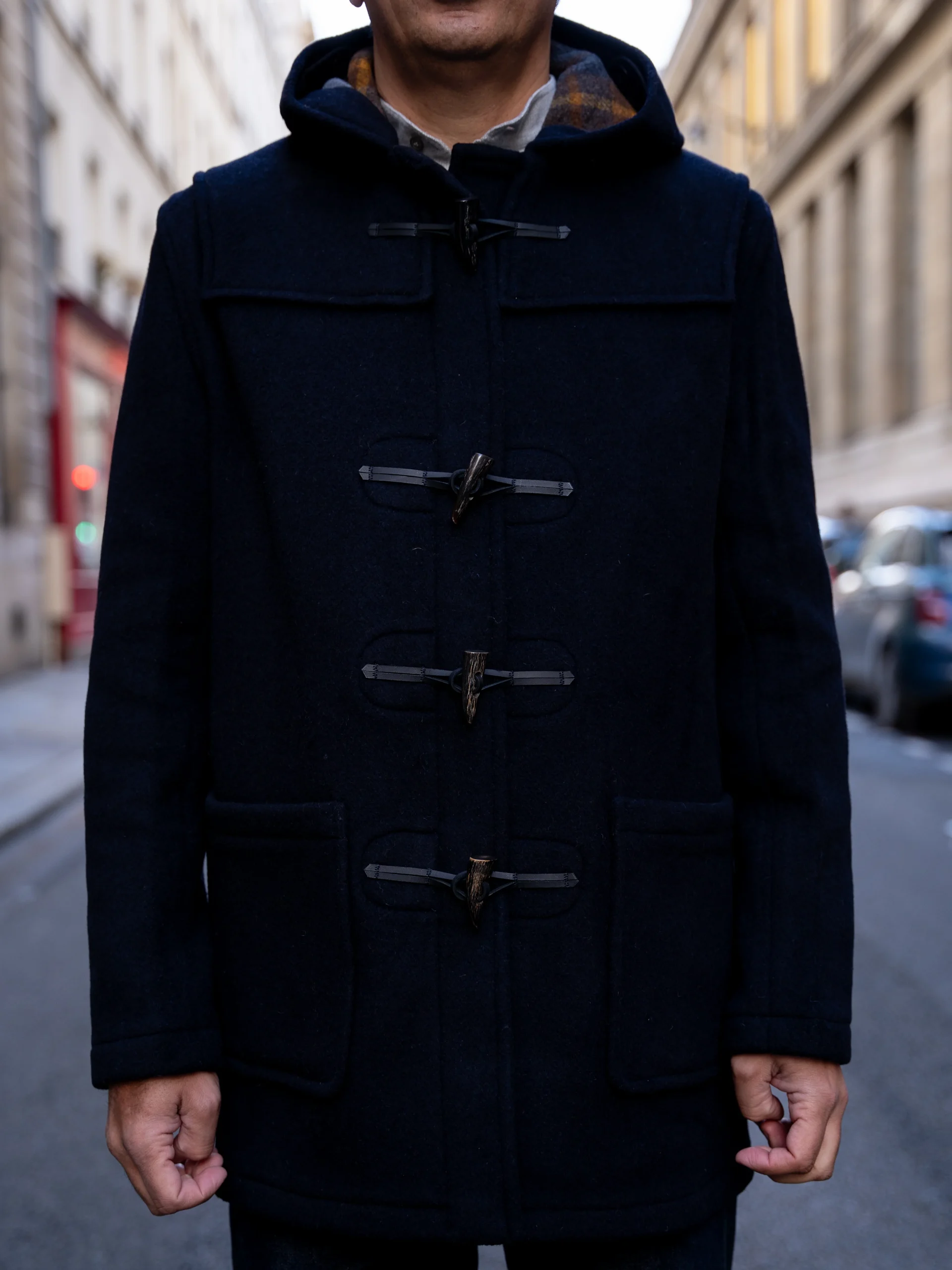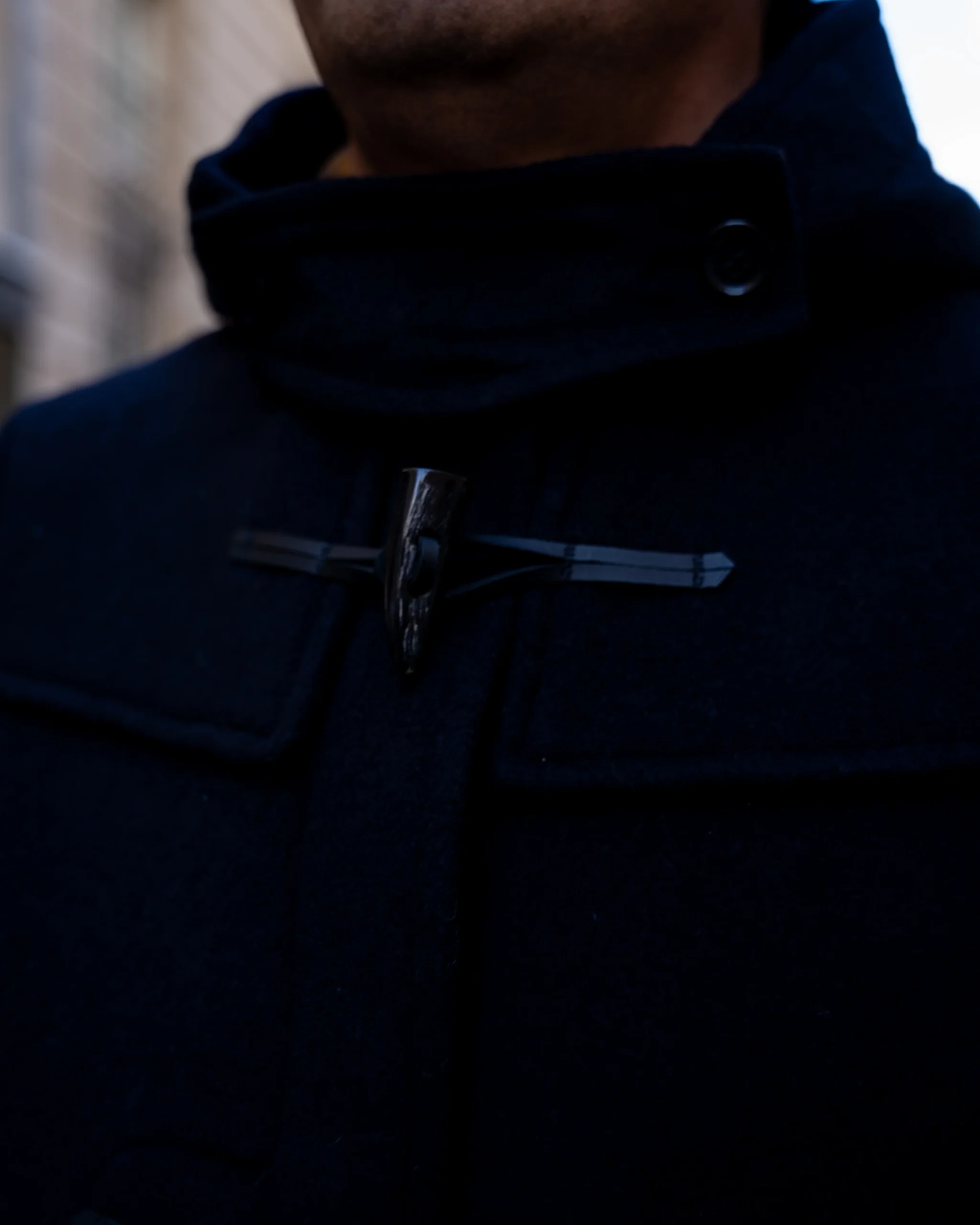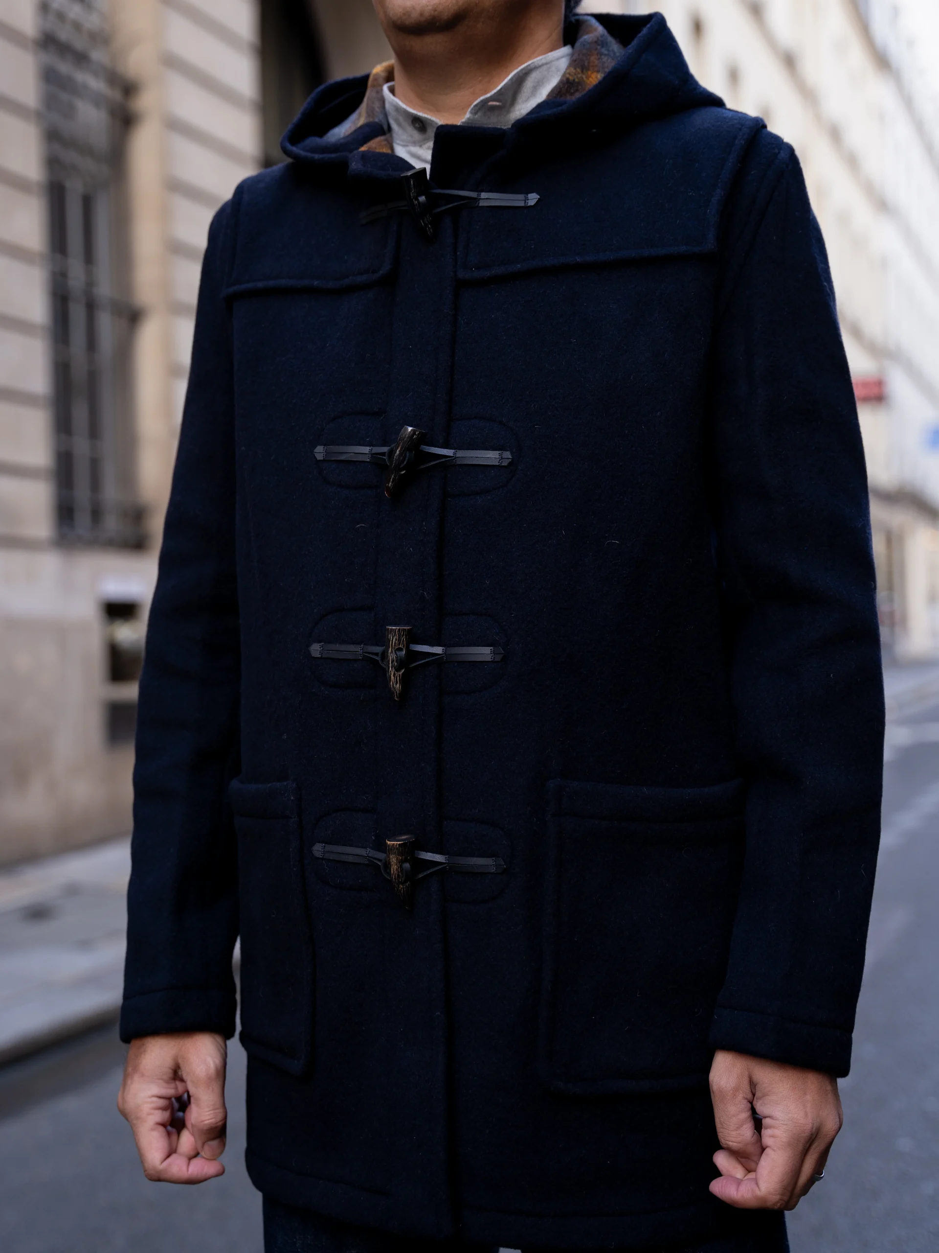 duffle-coat en drap de laine navy double-face __TAB__ fiche technique Duffle-coat Coupe droite Deux poches extérieures plaquées Une poche intérieure à fermeture velcro Boutons traditionnels en corne et lanières de cuir Empiècements aux épaules Capuche réglable Protection anti-tempête amovible au col Composition : 70 % laine, 18 % polyester, 8 % polyamide et 4 % […]