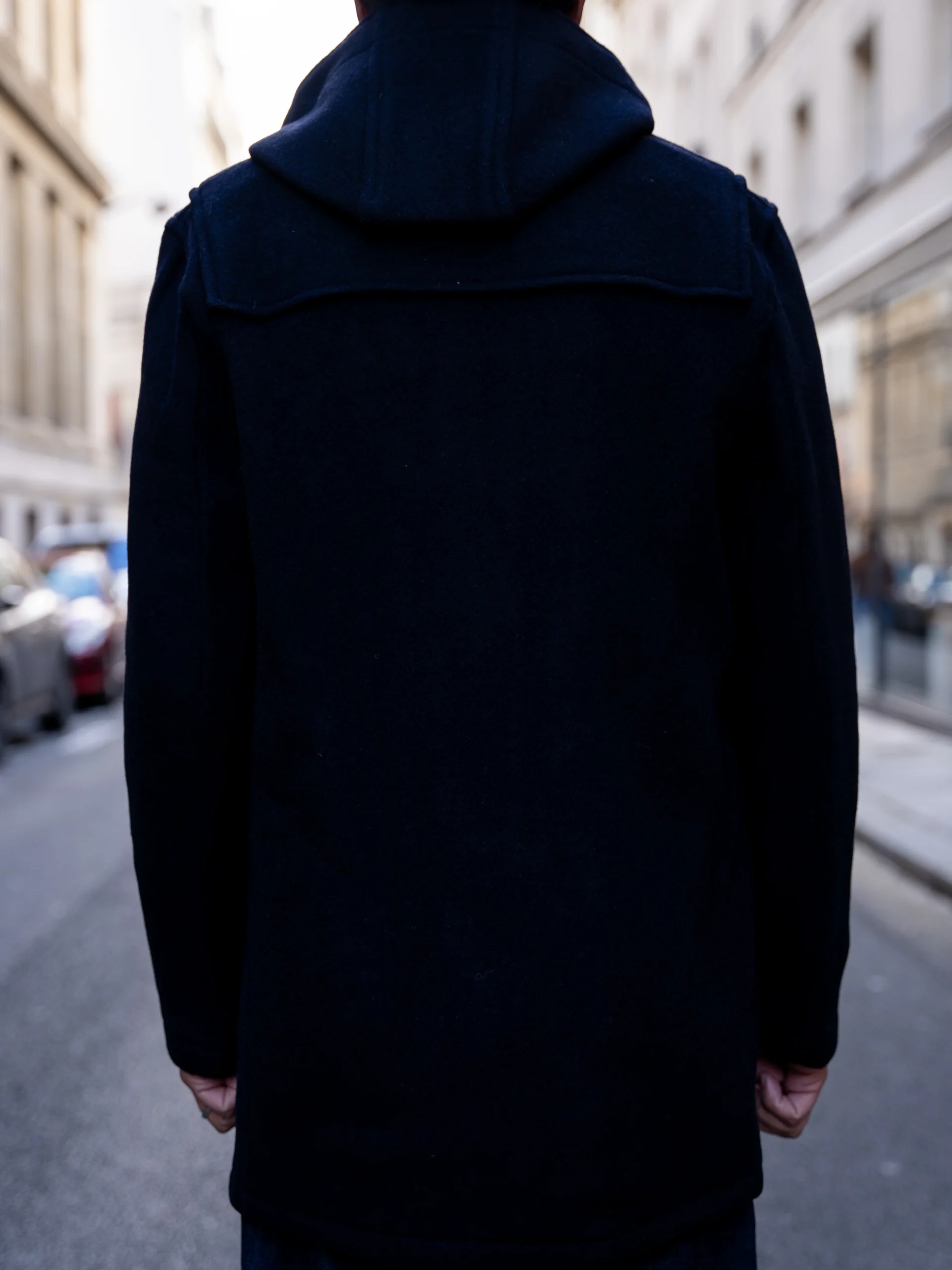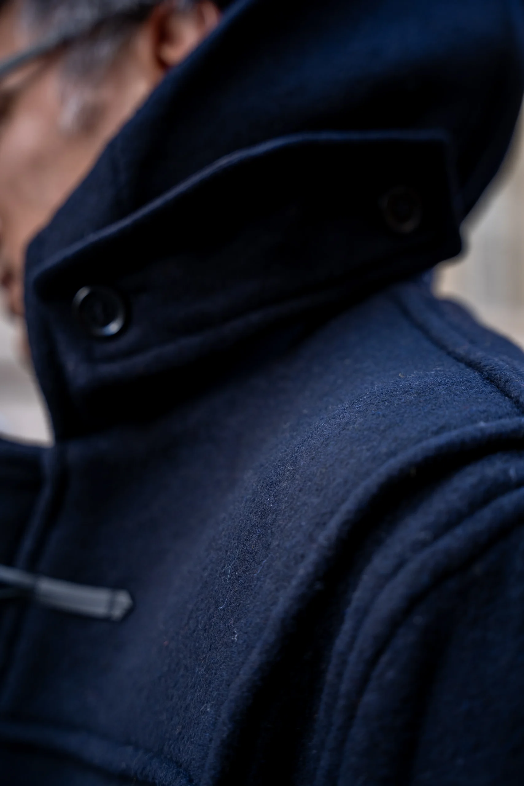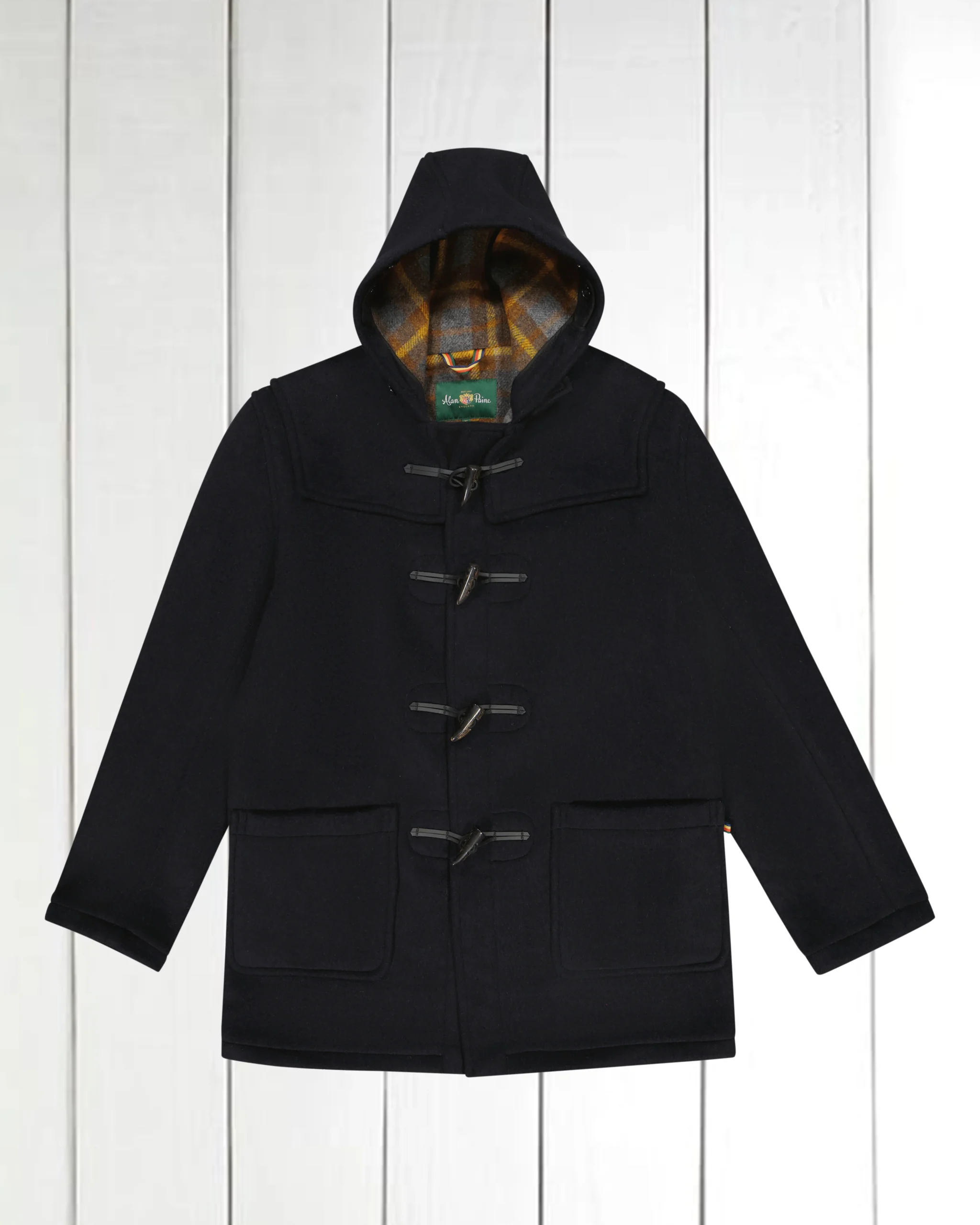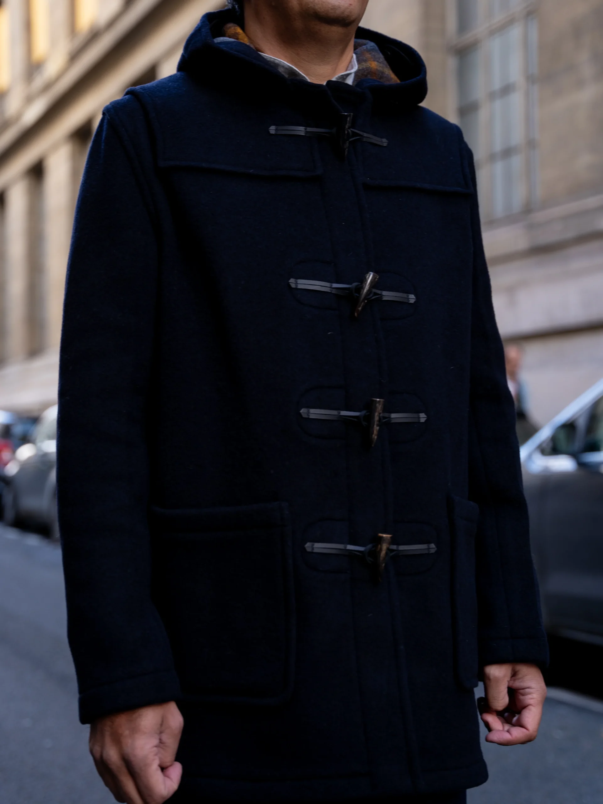 duffle-coat en drap de laine navy double-face __TAB__ fiche technique Duffle-coat Coupe droite Deux poches extérieures plaquées Une poche intérieure à fermeture velcro Boutons traditionnels en corne et lanières de cuir Empiècements aux épaules Capuche réglable Protection anti-tempête amovible au col Composition : 70 % laine, 18 % polyester, 8 % polyamide et 4 % […]