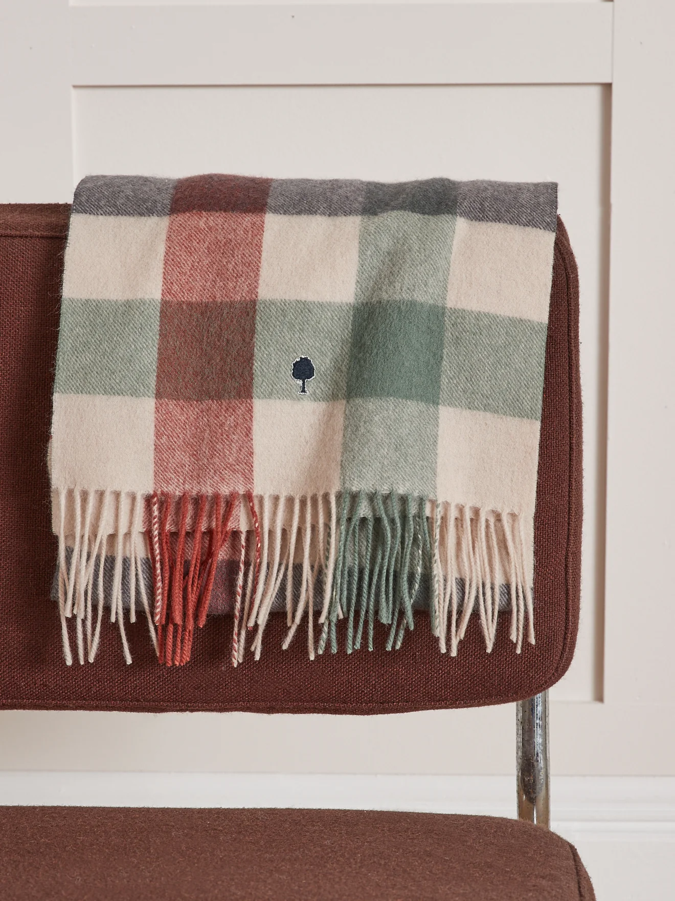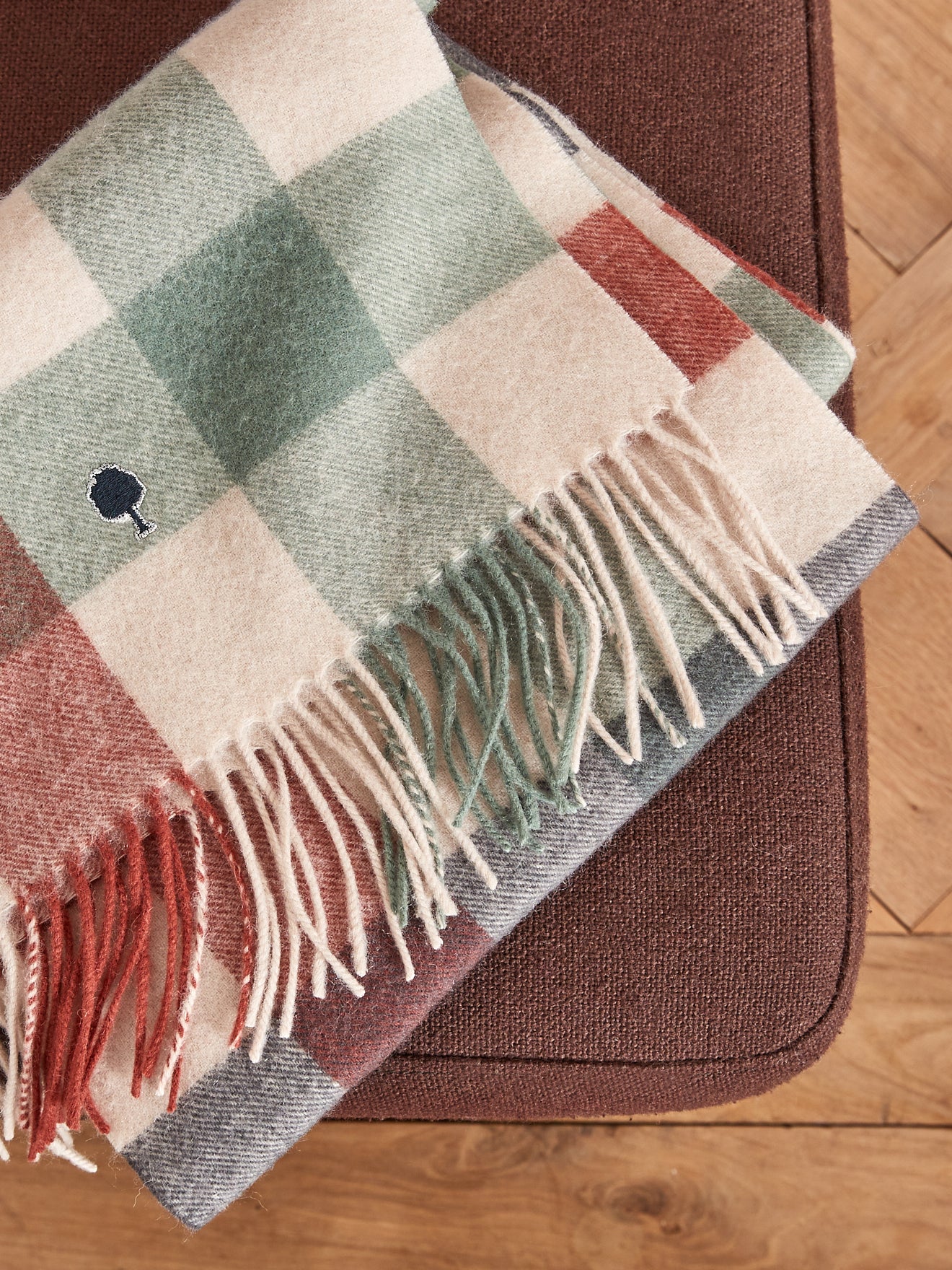 - Logo arbre brodé ; longues franges sur 2 côtés