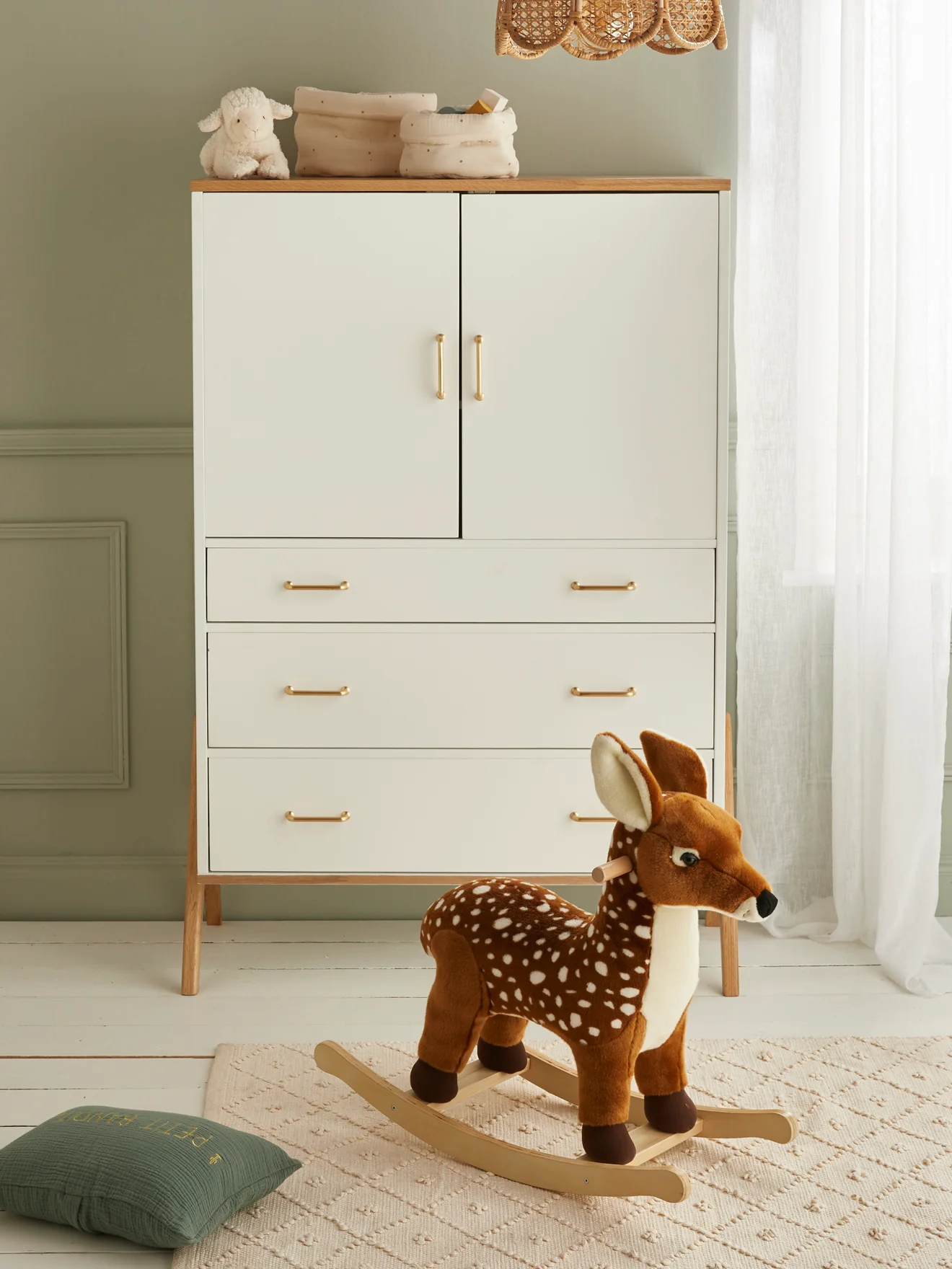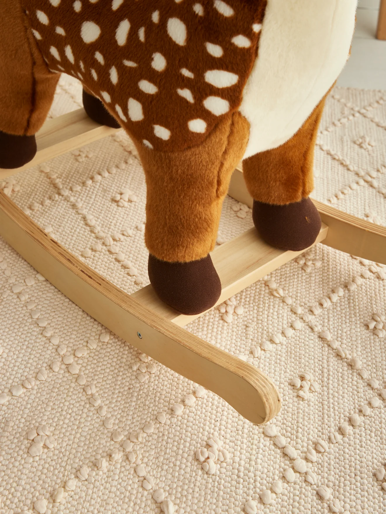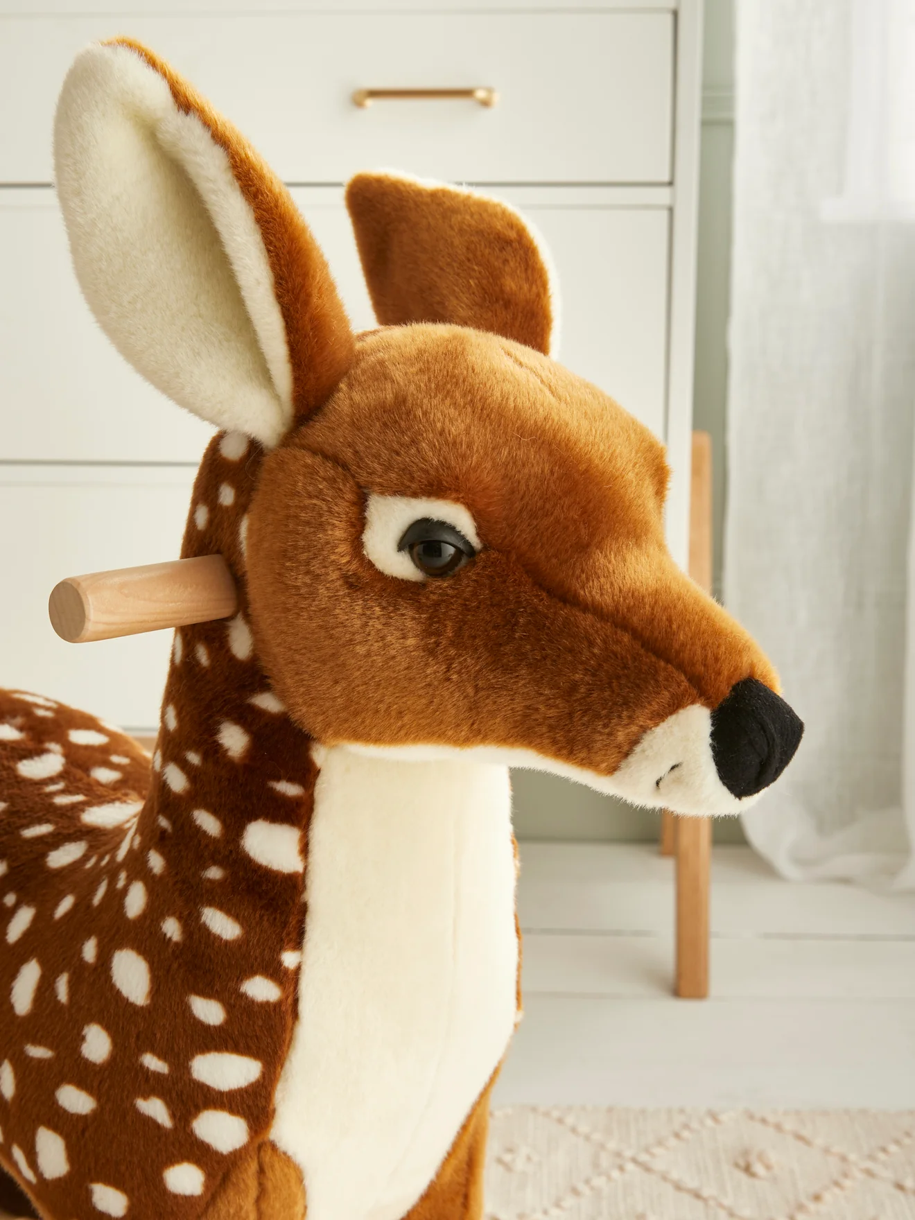 Le traditionnel cheval à bascule se décline dans une version nouvelle. Peluche XXL dotée de poignées et de repose-pieds, le faon à bascule demeure un jouet intemporel pour les petits et une jolie déco dans la chambre.