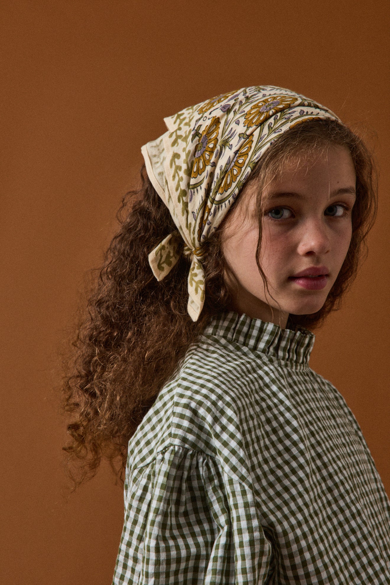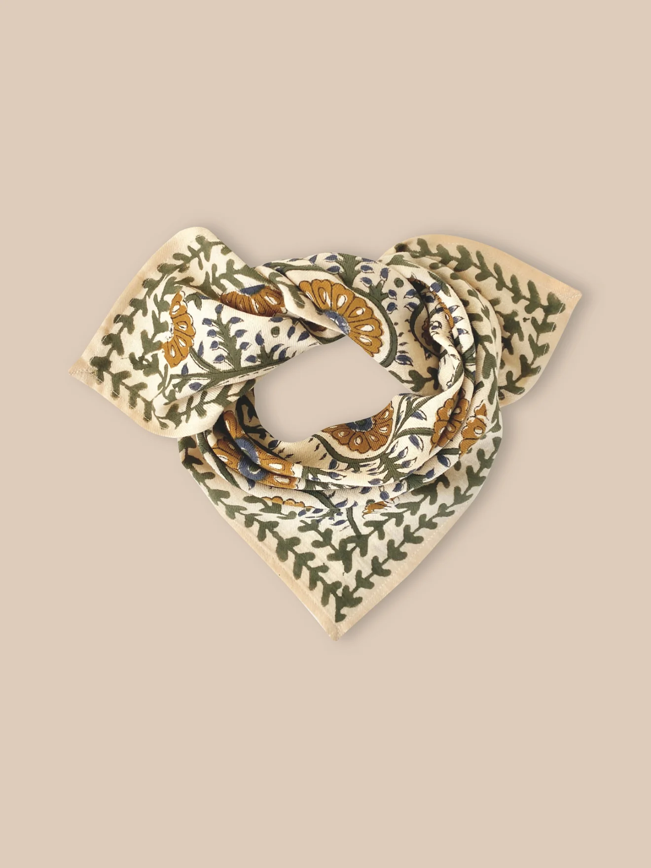 Foulard en coton confectionné artisanalement grâce à la technique indienne du block-print*. Ses couleurs sont réalisées à partir de pigments naturels. Cette confection manuelle peut entraîner certaines « irrégularités » dont nous aimons le charme.