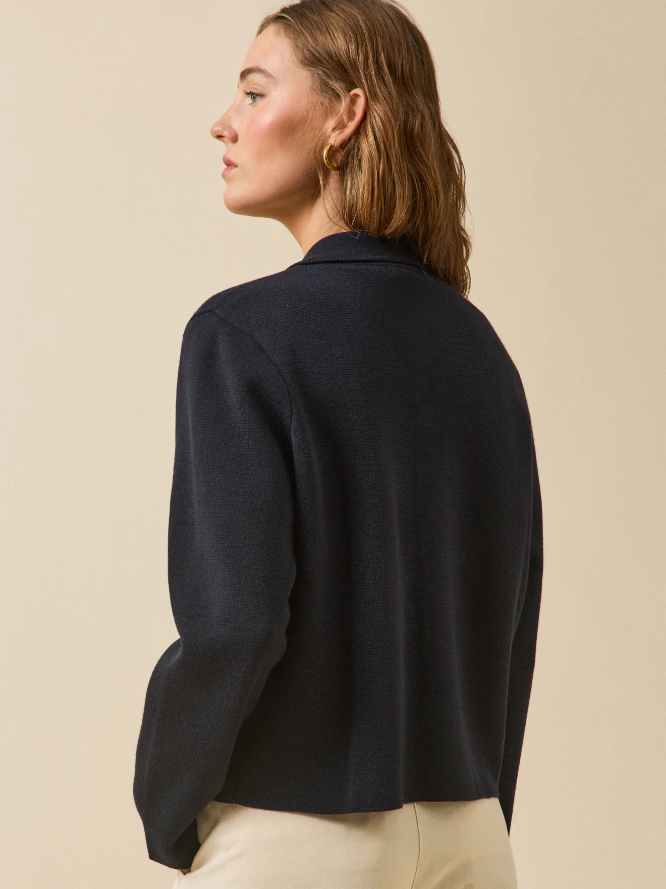Elle privilégie la simplicité. Volume pratique chic, entre veste et gilet, pour cette pièce en maille milano qualité lourde, enrichie de laine pour plus de chaleur.