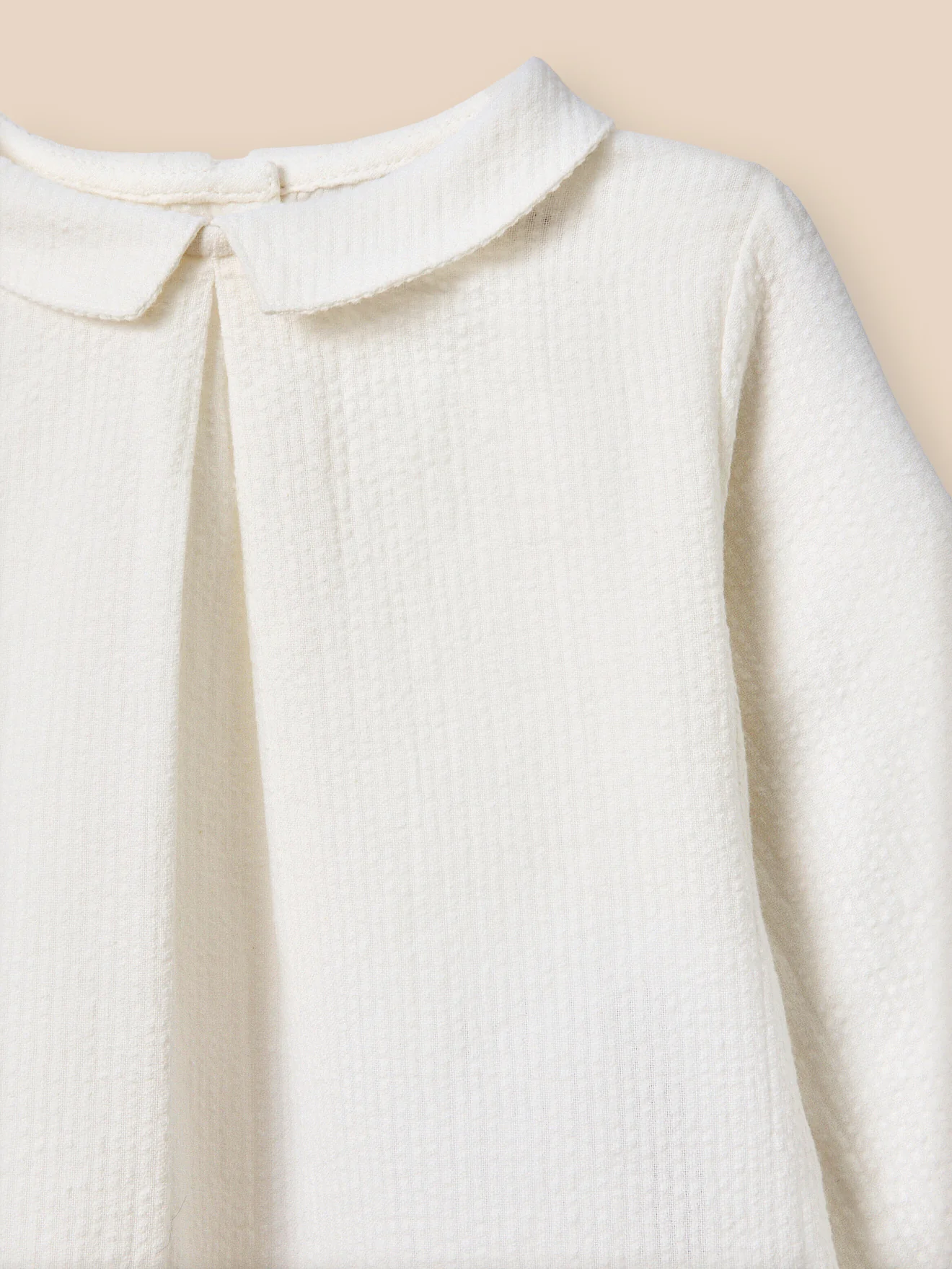 Cette guimpe en mini-seersucker apporte une touche de fraîcheur au vestiaire des nouveau-nés. Plis creux sous le col mac milan Ouverture totale au dos par boutons