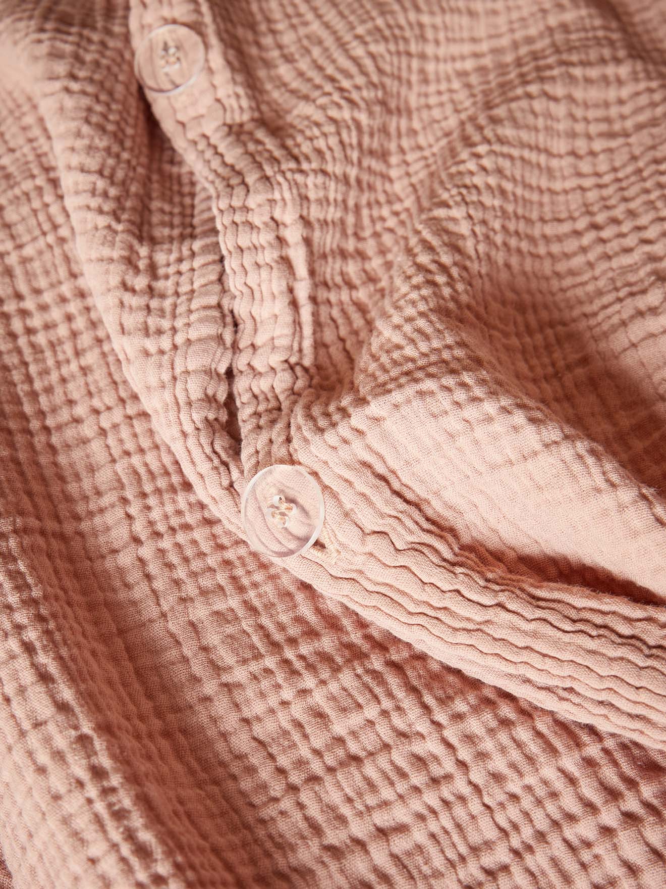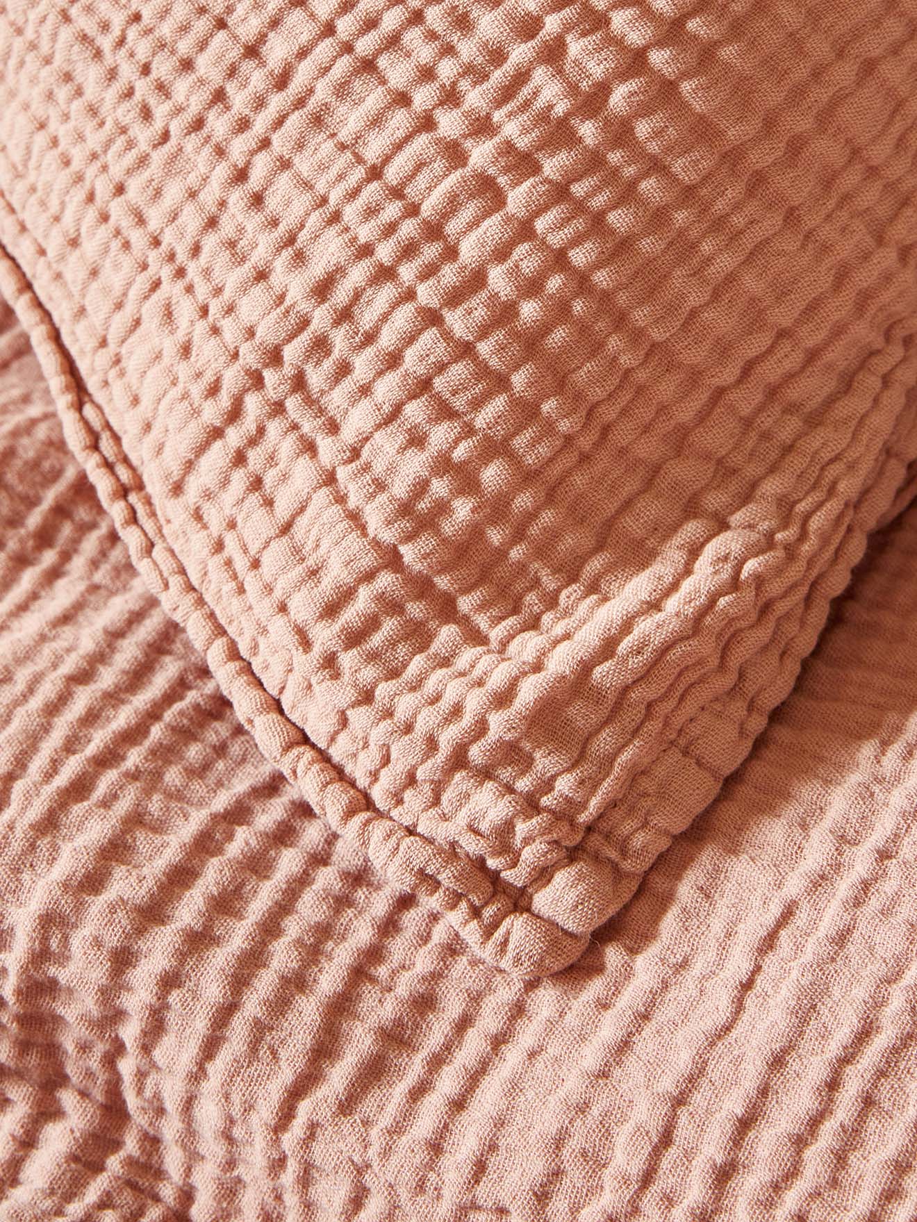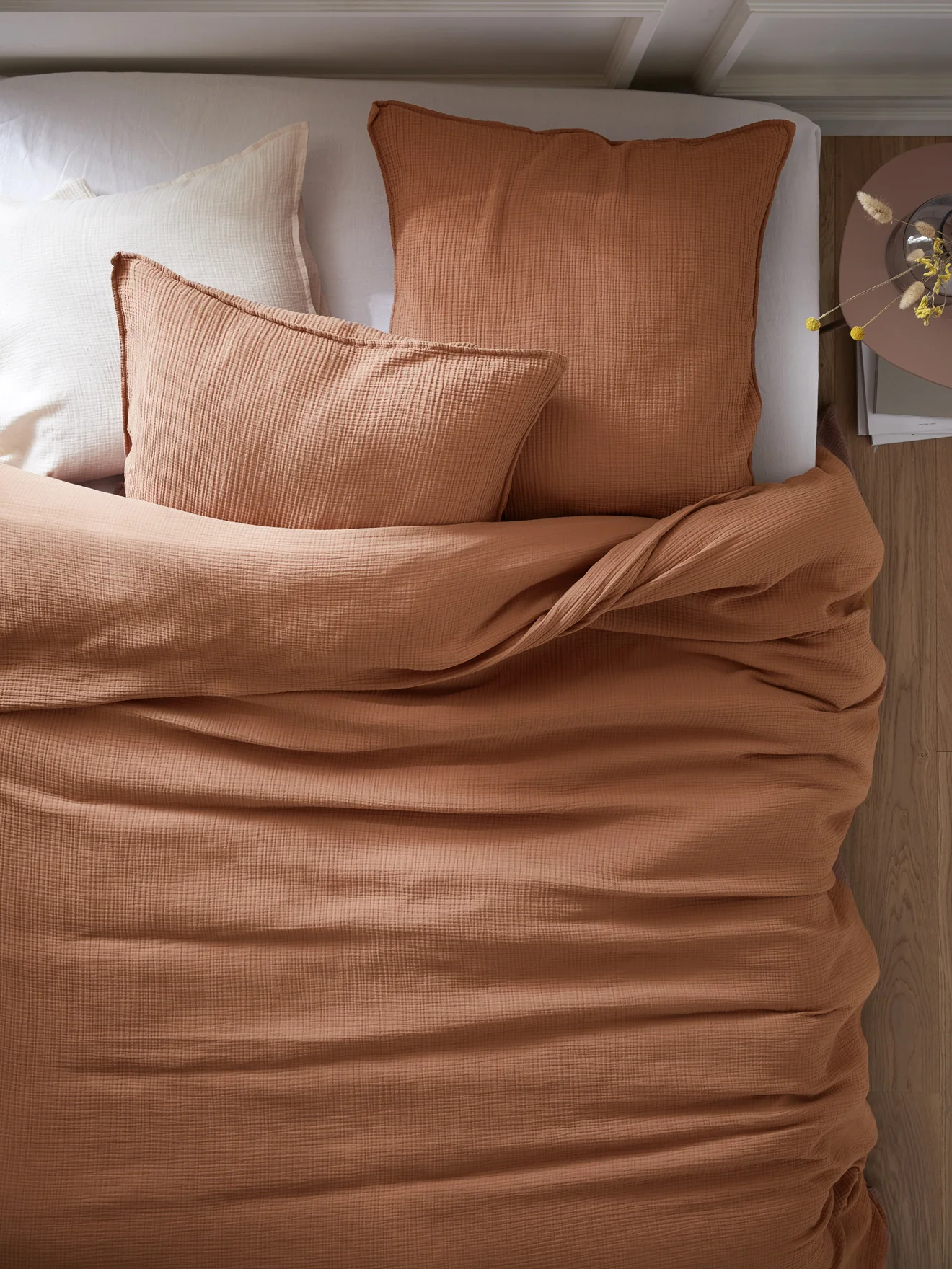 Housse de couette en gaze de coton tissée et confectionnée au Portugal. Son aspect légèrement gaufré procure une réelle sensation de confort doux et aérien.