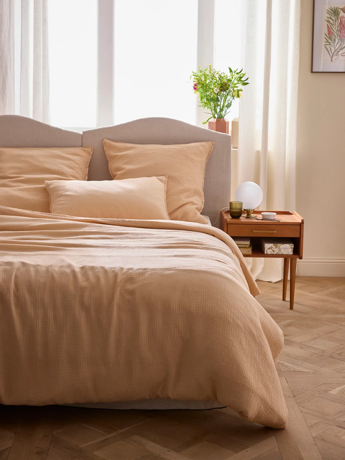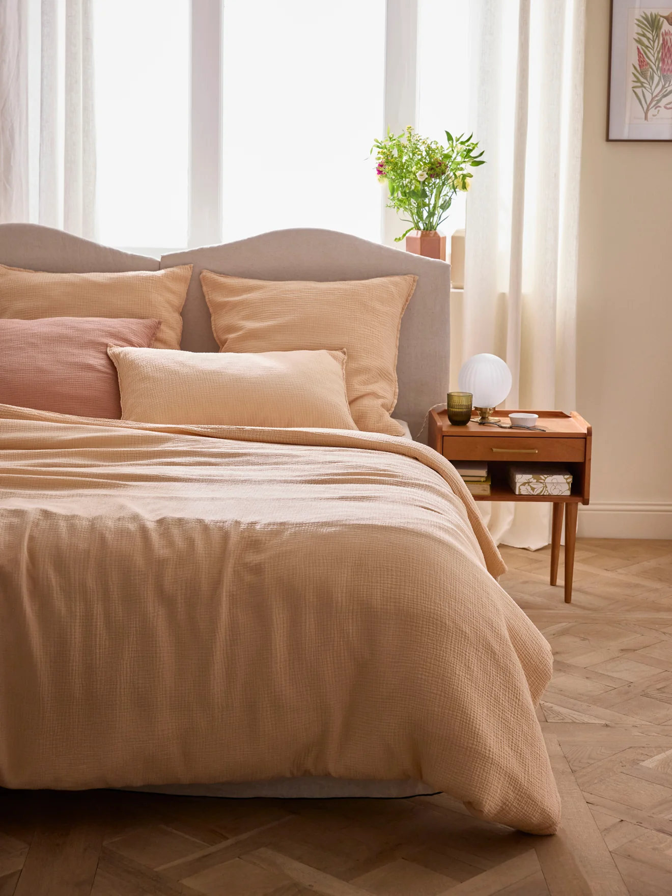 Housse de couette en gaze de coton tissée et confectionnée au Portugal. Son aspect légèrement gaufré procure une réelle sensation de confort doux et aérien.
