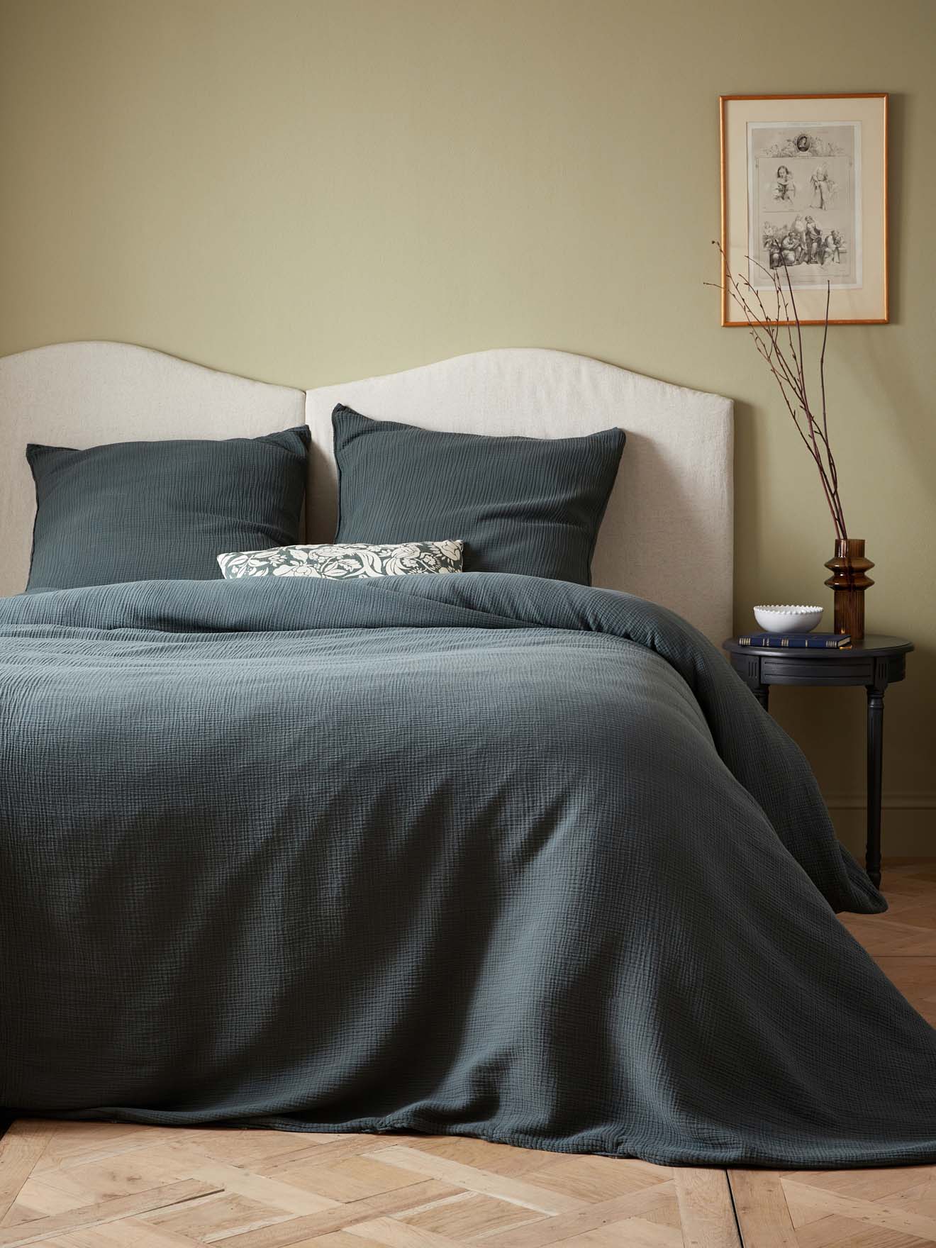 Housse de couette en gaze de coton tissée et confectionnée au Portugal. Son aspect légèrement gaufré procure une réelle sensation de confort doux et aérien.
