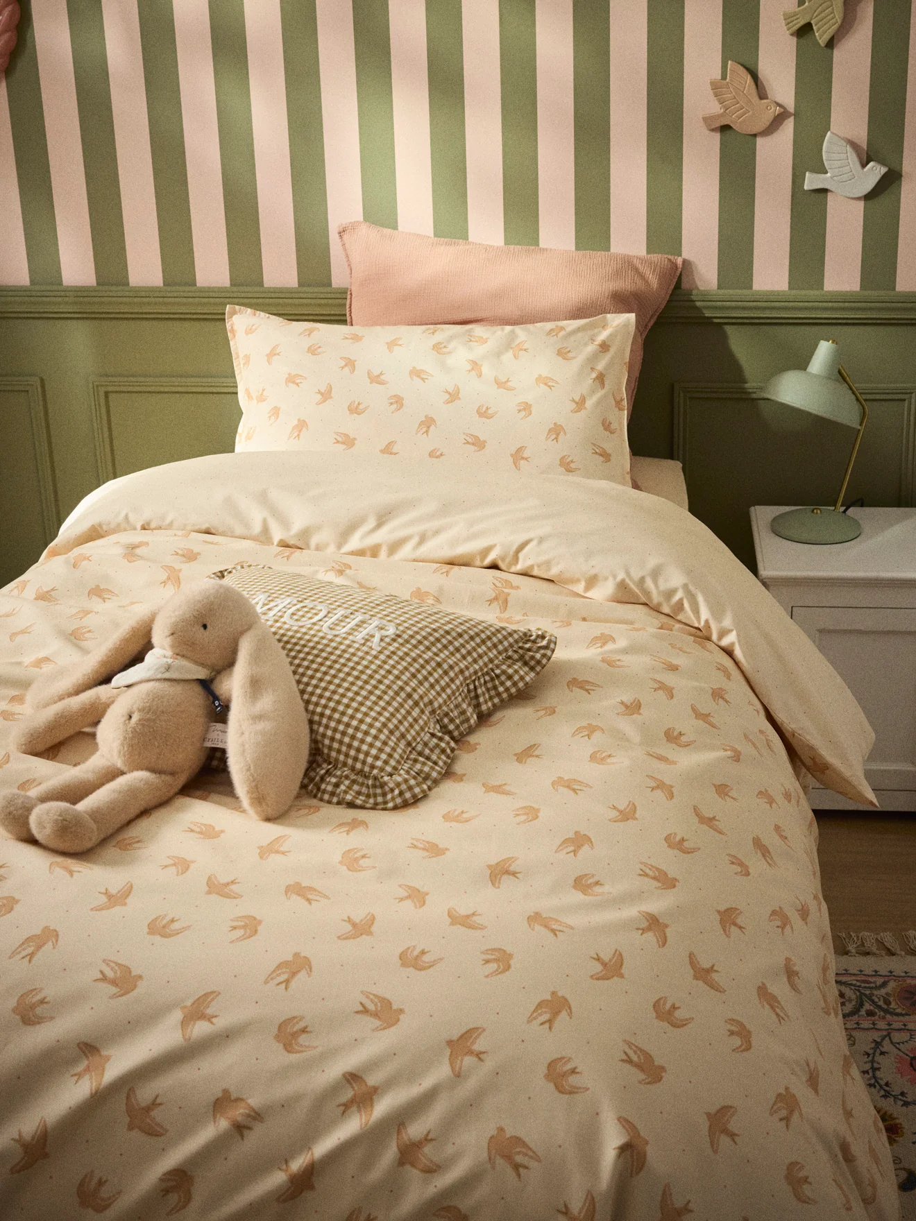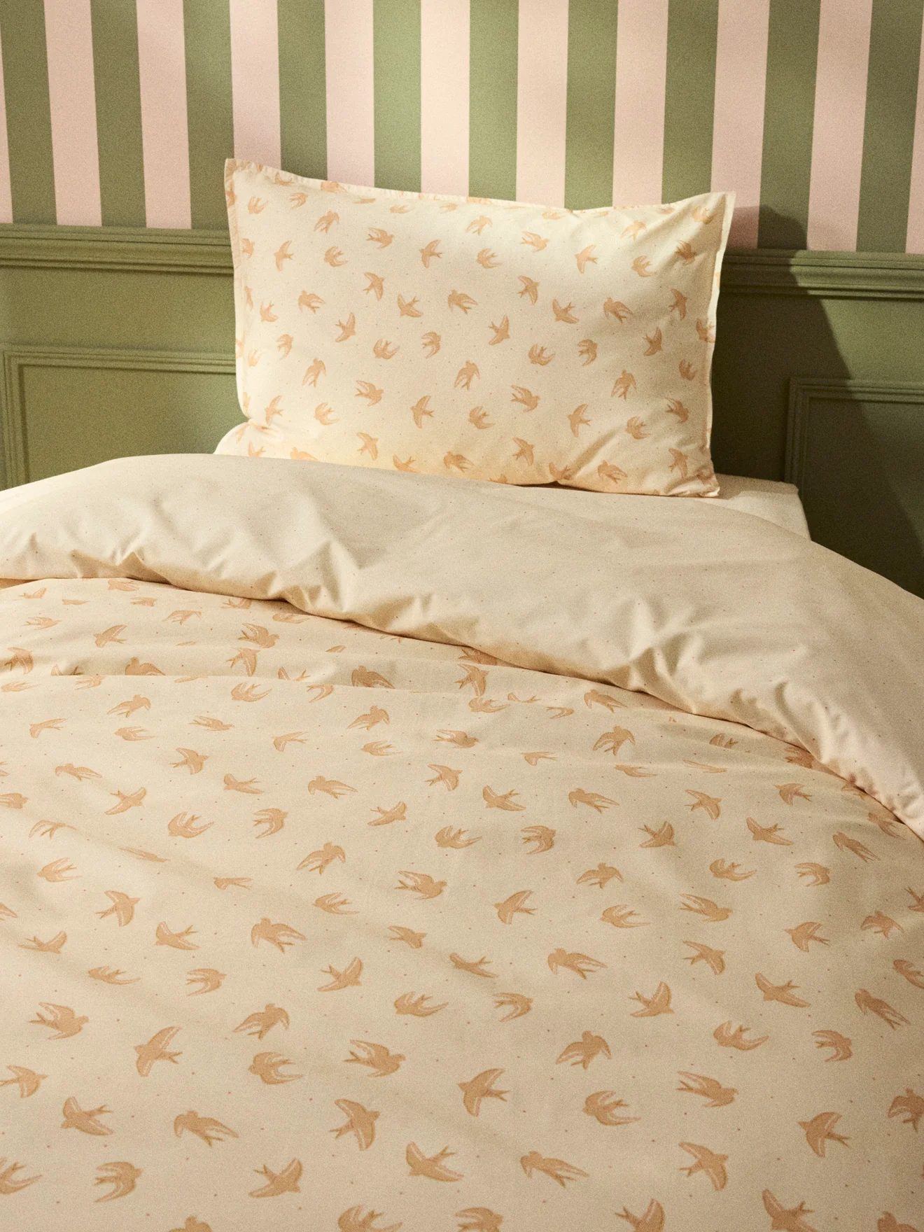 Envolée de colombes sur une belle percale de coton parsemée de petits pois coloris terracotta sur fond nude. Housse de couette avec rabat de pieds pour border.