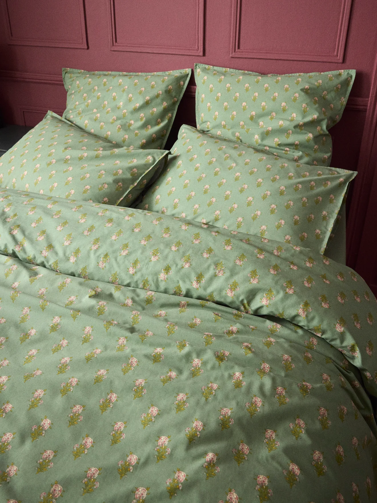 Comme des petits bouquets d’oeillets… Housse de couette Antoinette en percale de coton douce et résistante, imprimée d’un côté et unie de l’autre. Création Cyrillus.