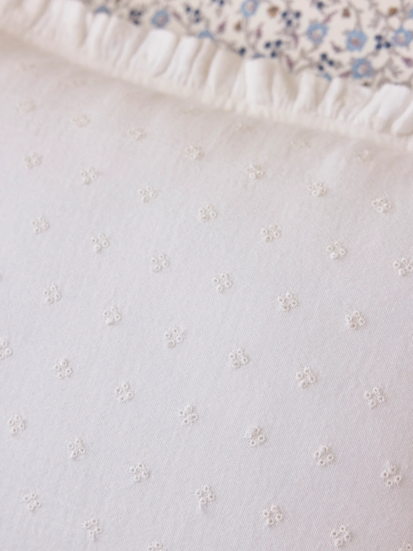 Taie de coussin au charme pur et raffiné, avec petite broderie anglaise et contour volanté.