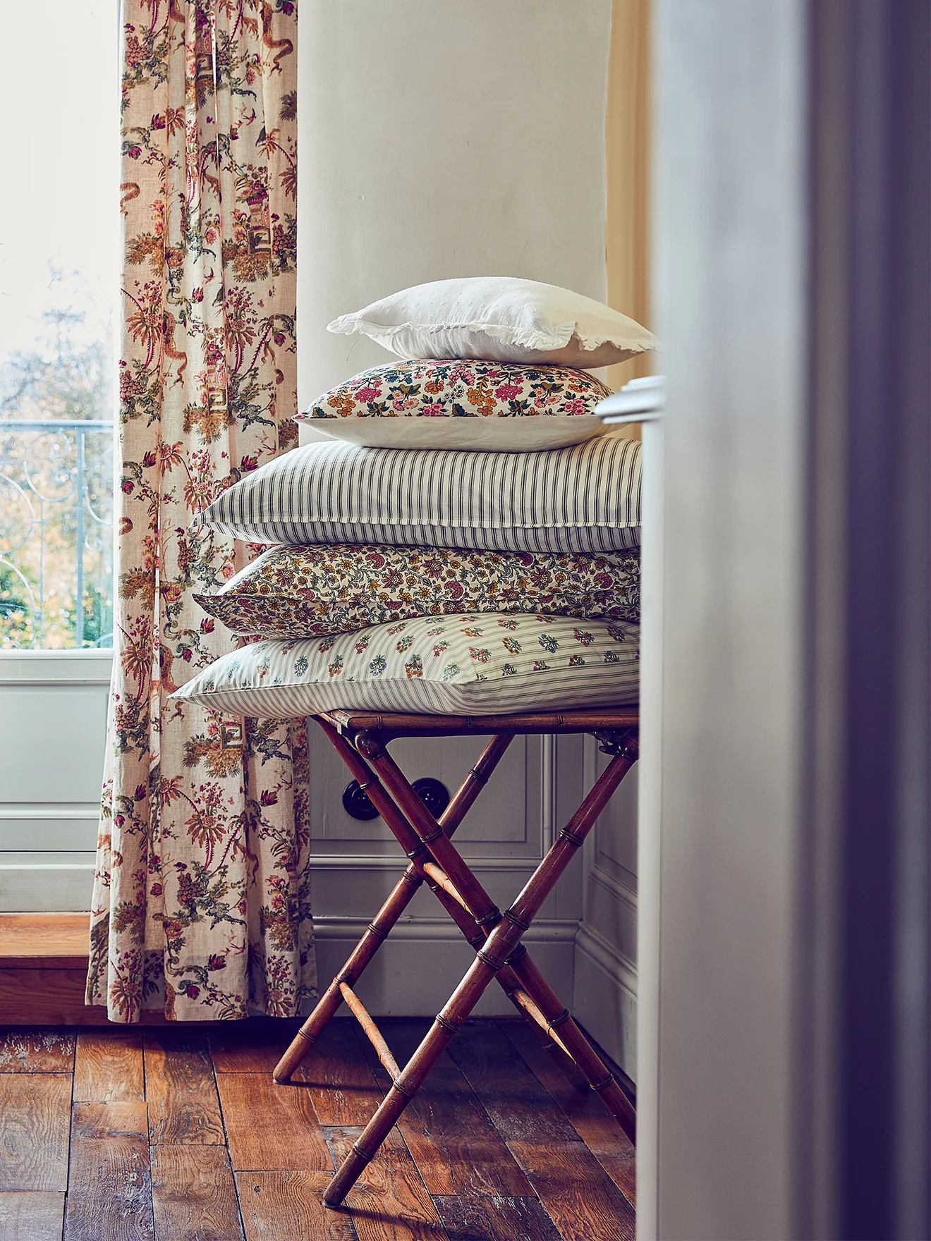 Taie de coussin au charme pur et raffiné, avec petite broderie anglaise et contour volanté. Fermeture boutonnée au dos Livrée sans coussin de garnissage.
