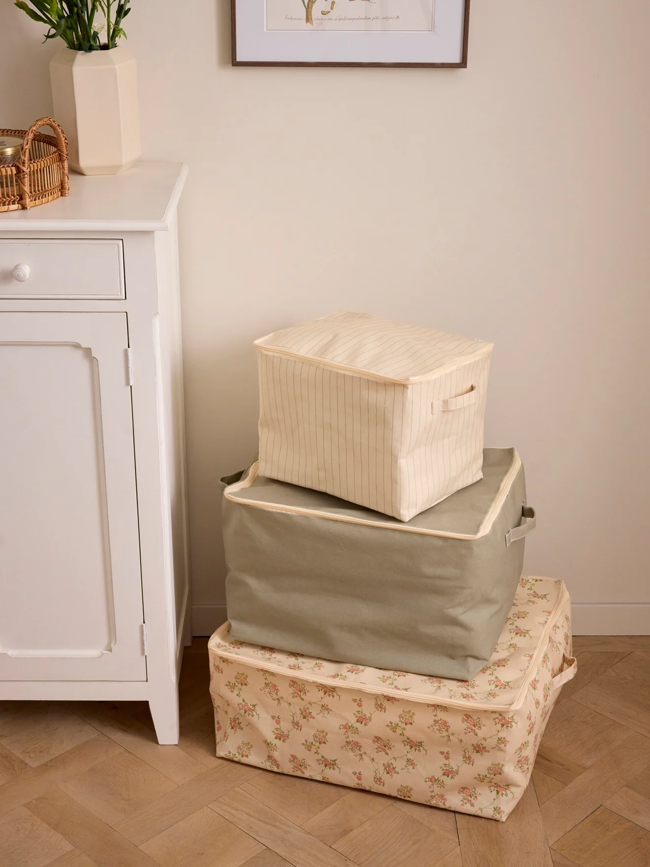 3 housses en toile, de taille et de motif différents, pour un rangement facile et esthétique. L’intérieur plastifié permet un nettoyage à l’éponge humide. 2 poignées pour housses 1 et 2. 1 poignée pour housse 3.