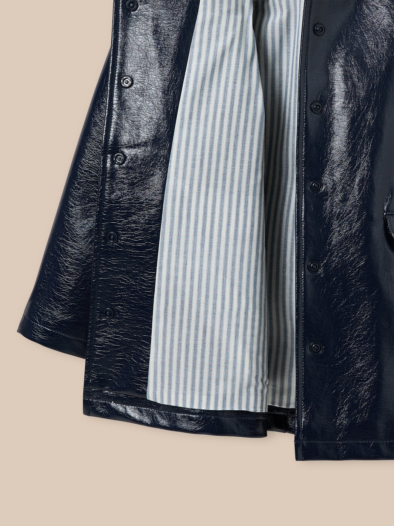 Grand retour du vinyle : un imperméable confortable et pratique, doté d’une capuche amovible. Fermeture par pressions. 2 poches plaquées à rabat Vinyle déperlant, doublure rayée Longueur dessus genou + doublure