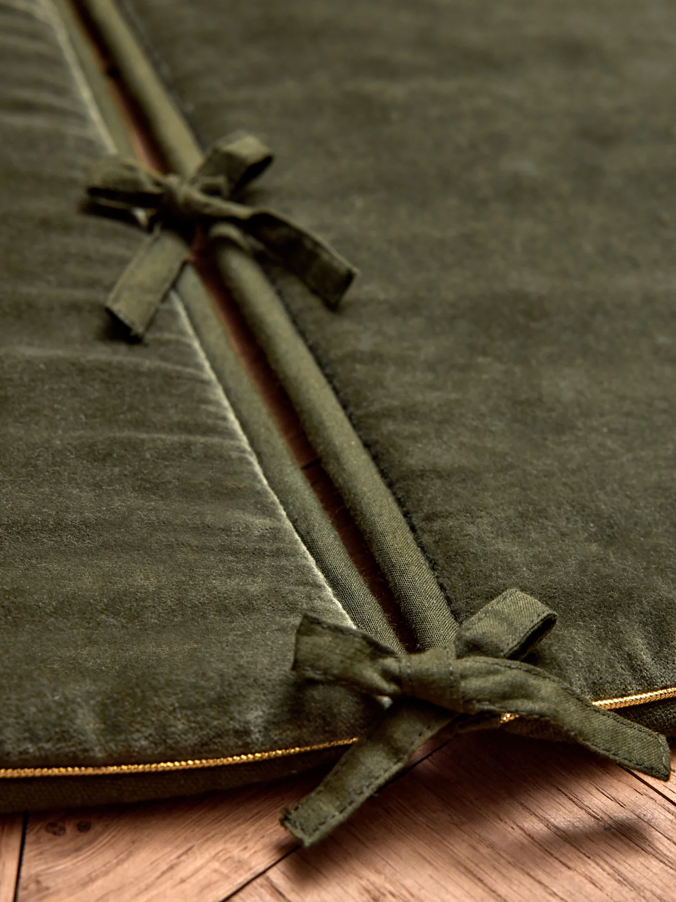 Jupe de sapin en velours ras d’un côté et en coton canvas de l’autre. Il est bordé d’un passepoil en fil doré et se ferme à l’aide de nouettes. Accessoire utile et raffiné pour décorer le pied de sapin.