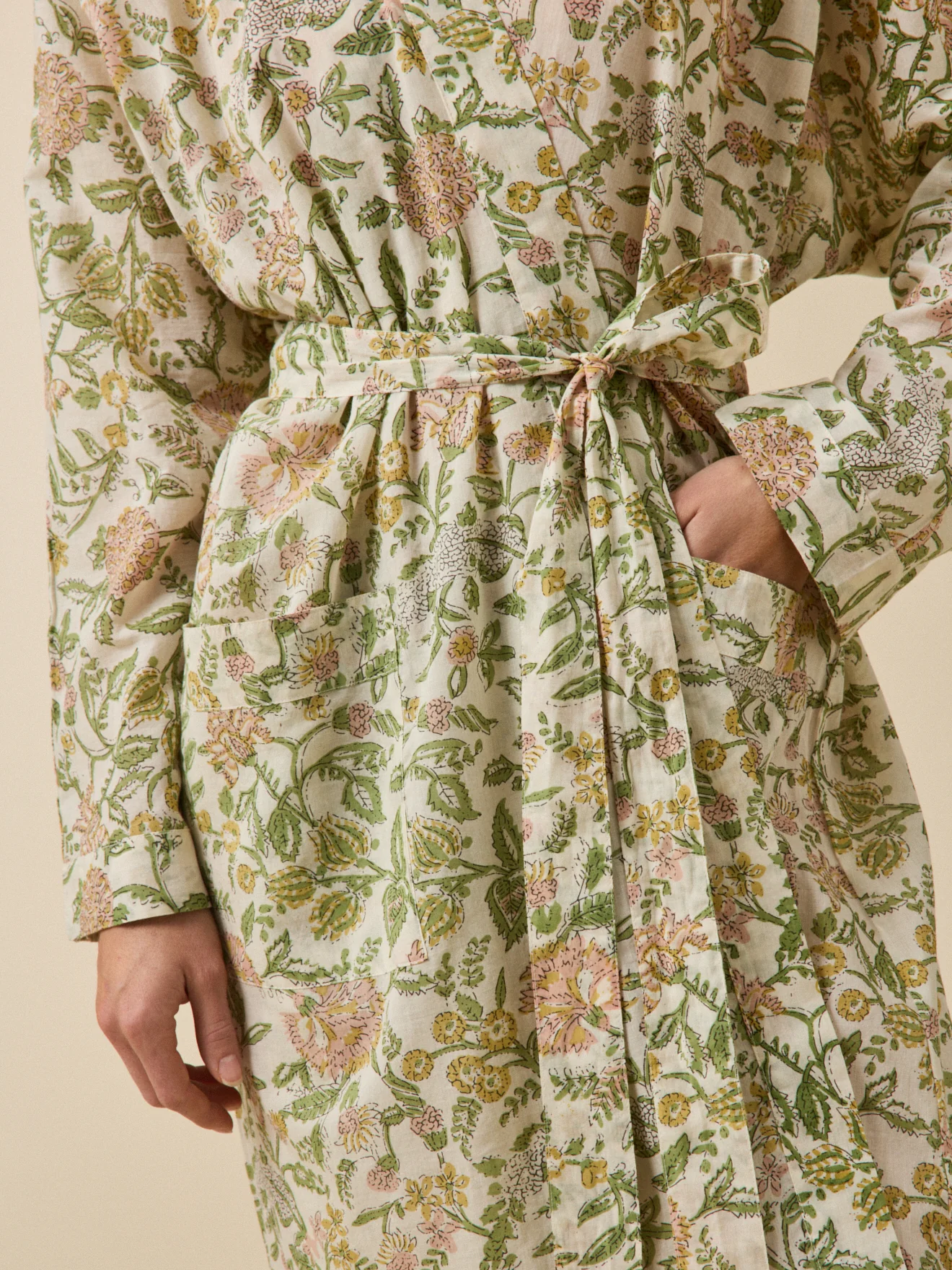 Inspiré des kimonos japonais, ce kimono s’approprie le charme et l’authenticité des motifs indiens imprimés de manière artisanale. Confectionné en voile de coton, il est léger et confortable. L’impression artisanale peut présenter d’éventuelles irrégularités. 2 poches plaquées. Ceinture assortie sous passants. Longueur 107 cm env. Largeur bas de manches 17 cm env.