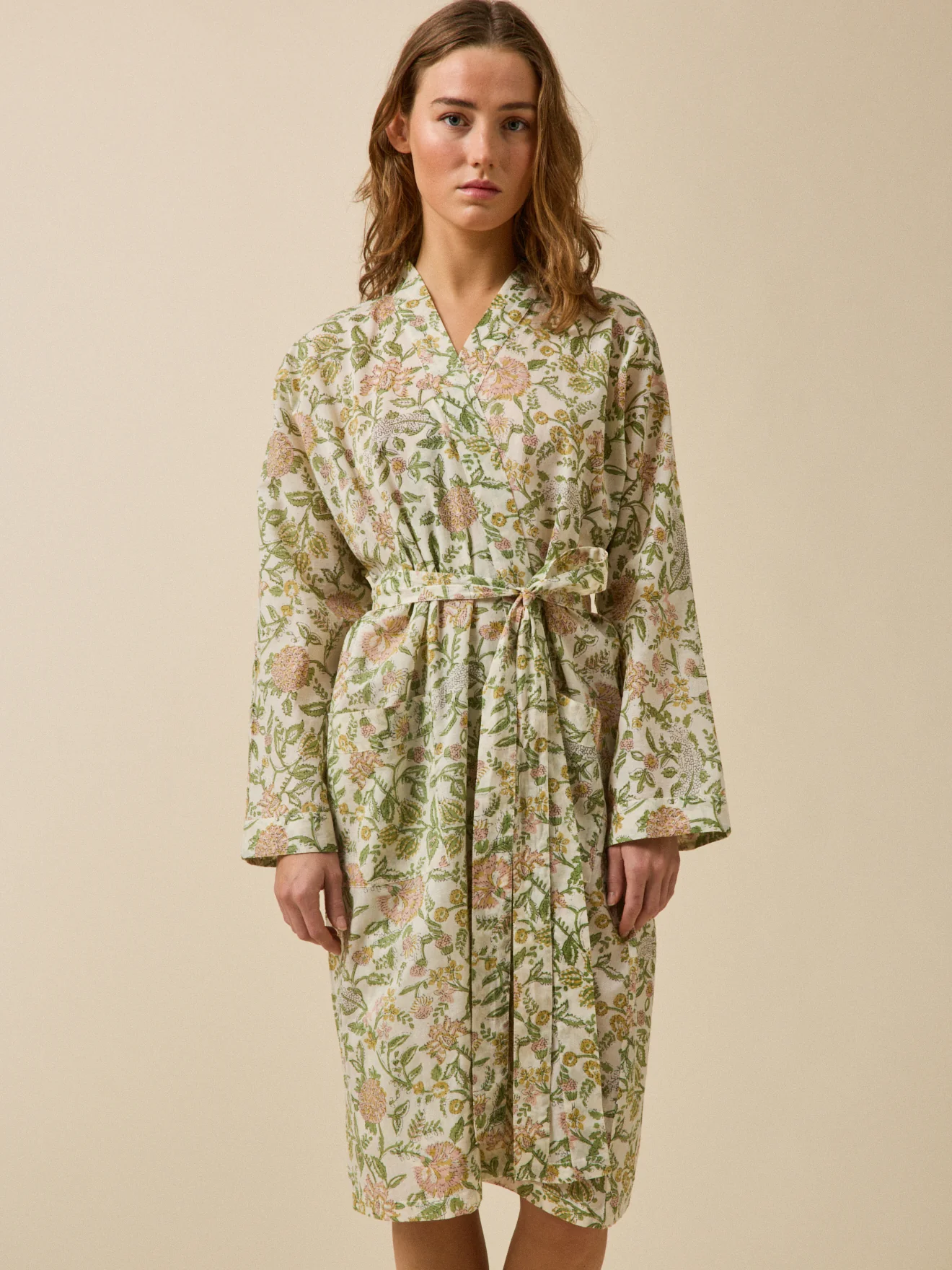 Inspiré des kimonos japonais, ce kimono s’approprie le charme et l’authenticité des motifs indiens imprimés de manière artisanale. Confectionné en voile de coton, il est léger et confortable. L’impression artisanale peut présenter d’éventuelles irrégularités.