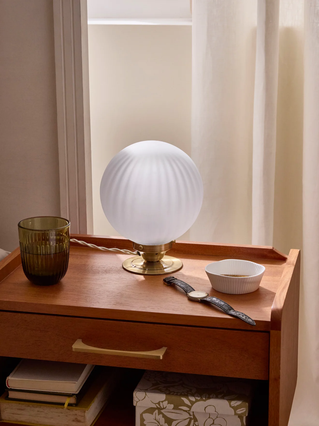 Lampe boule Doria inspirée des lampes vintage. Globe en verre dépoli légèrement strié. Socle fin en laiton finition antique. Lampe à poser fabriquée au Portugal. Diamètre 17 cm env. Hauteur totale 21 cm env. Câble torsadé en textile coloris ivoire 2 m. Livrée avec vis. Ampoule non fournie (LED E14, 5W max).
