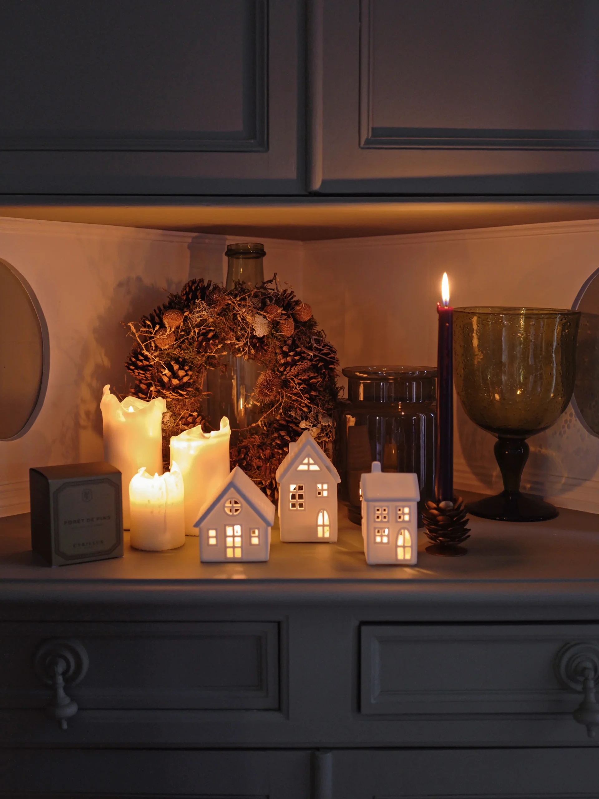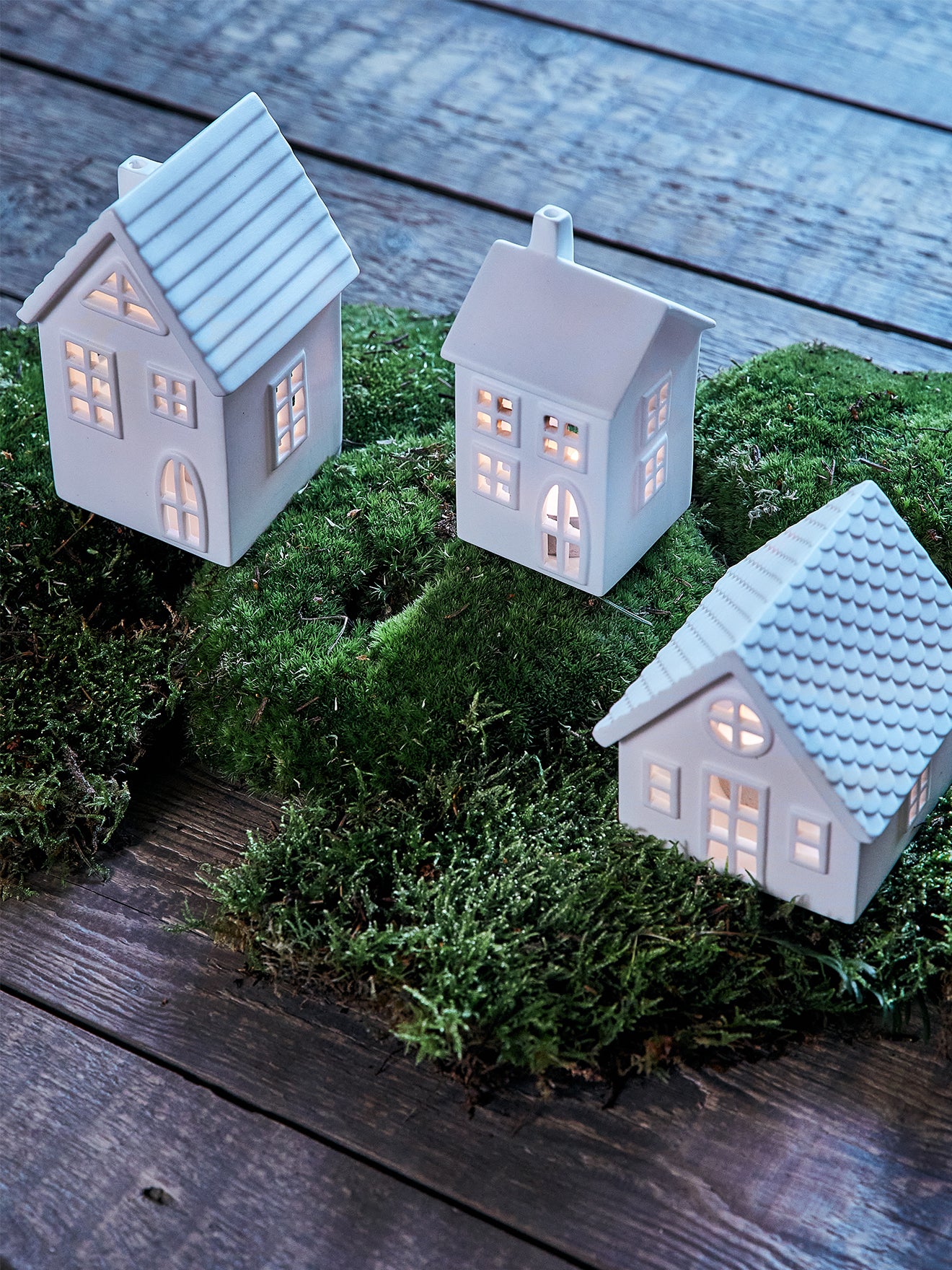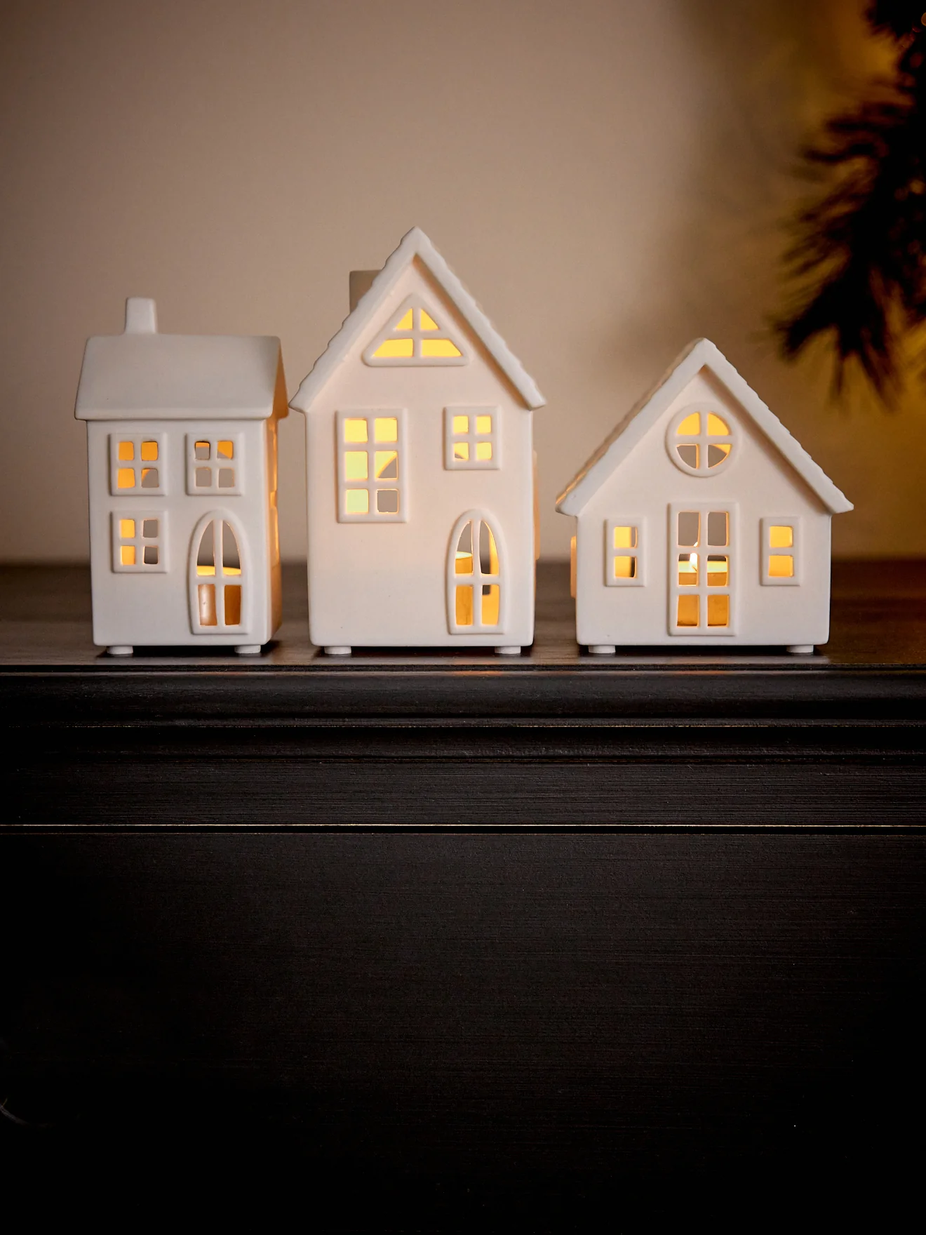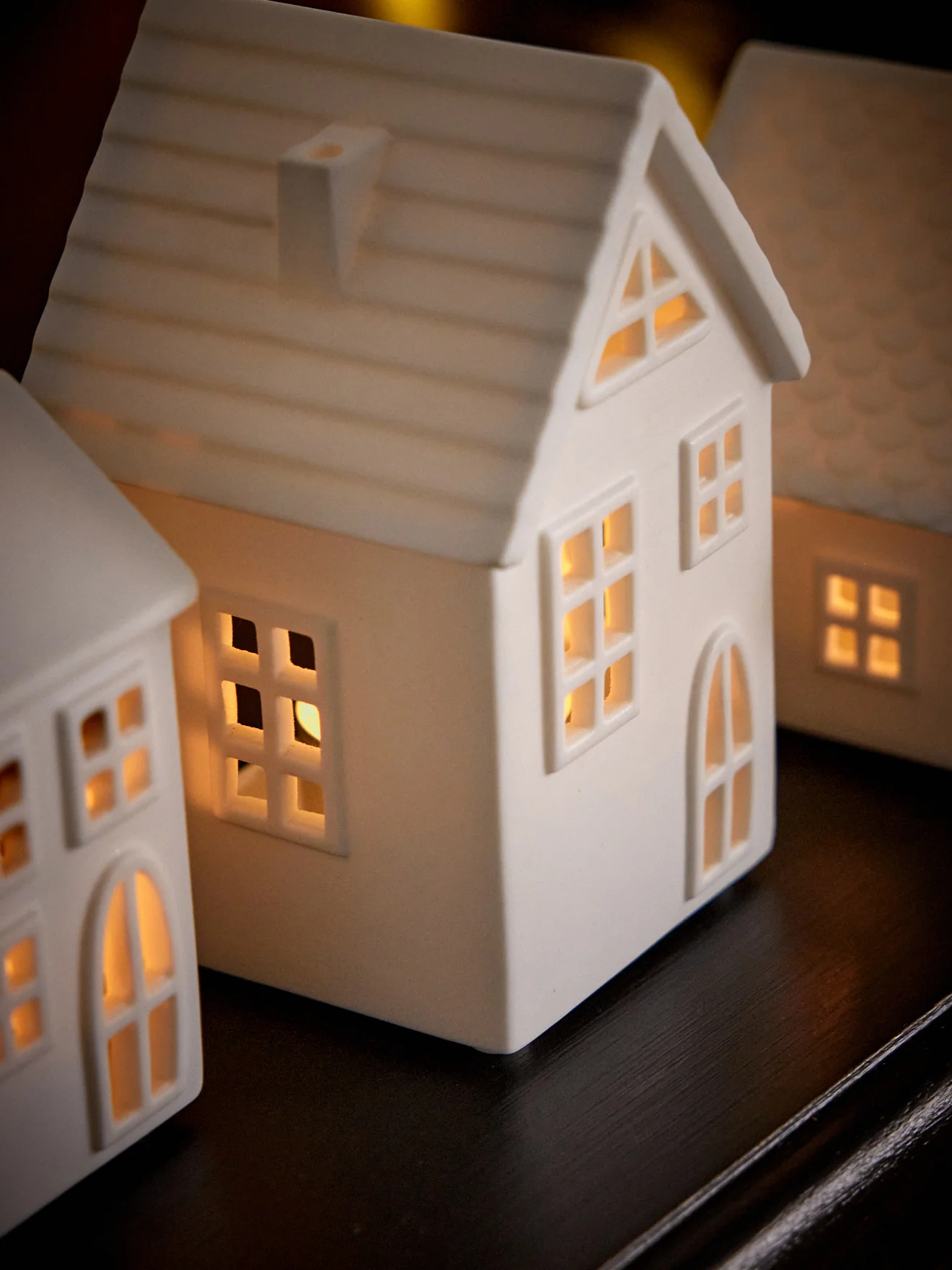 3 photophores en biscuit de céramique, coloris blanc mat. Le biscuit est une faïence cuite sans émaillage. Petites maisons décoratives conçues pour accueillir une bougie chauffe-plat.